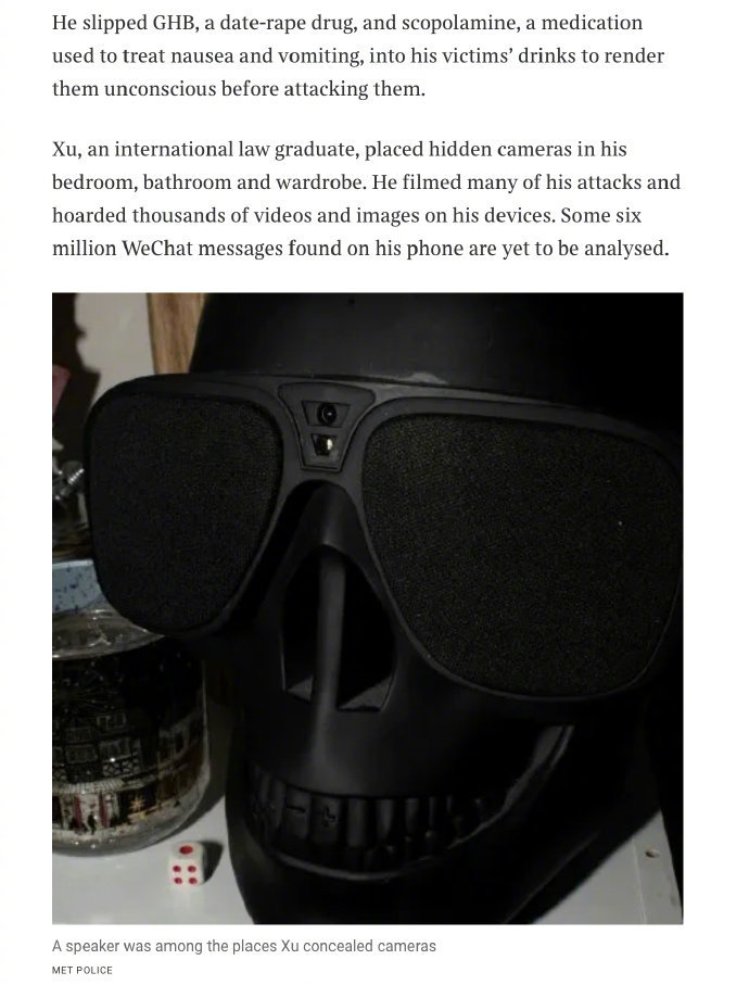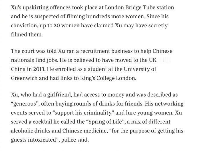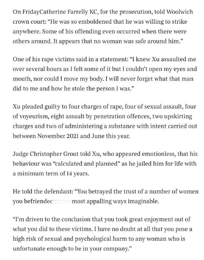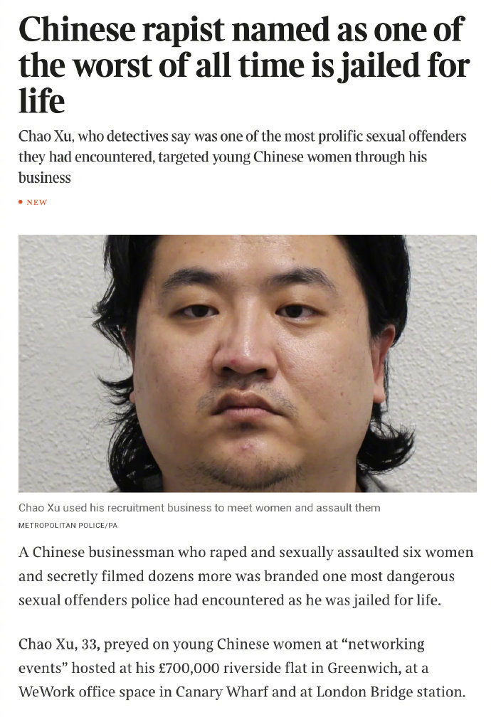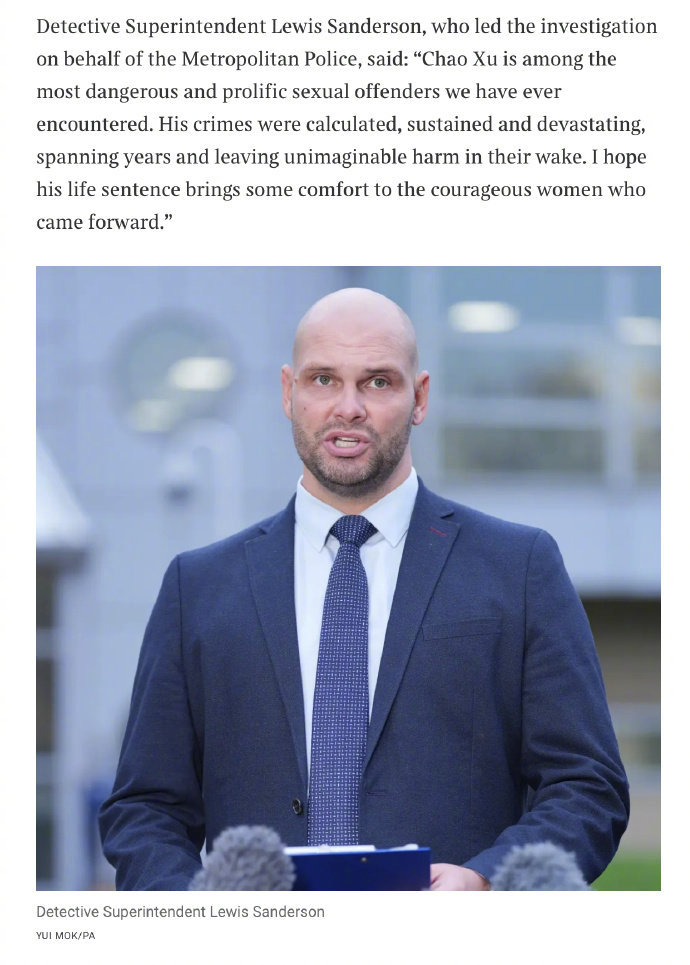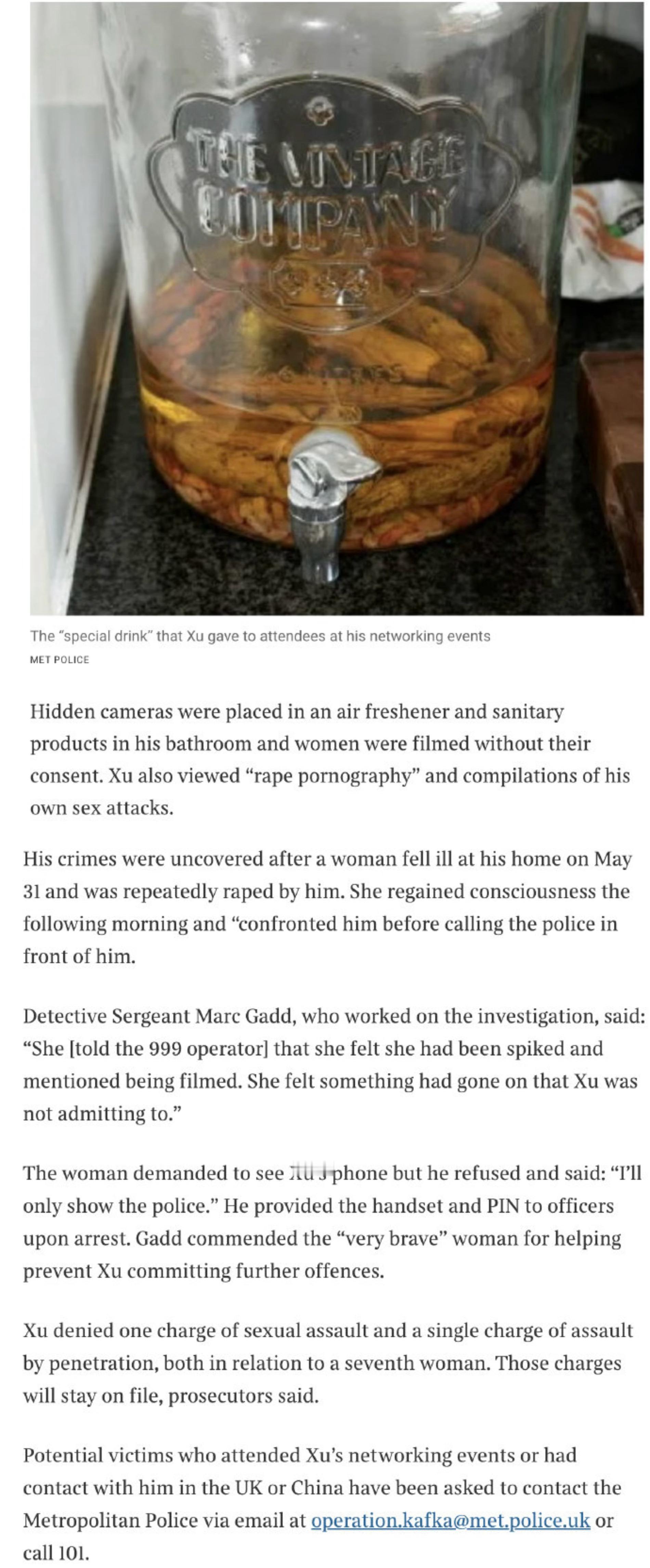 徐超因犯有24项性侵相关罪名,被判处终身监禁,最低服刑14年。英国伦敦大都会警察局消息,伦敦伍尔维奇刑事法院于11月14日作出判决,33岁中国籍男子徐超(Chao Xu,音译)因犯有24项性侵相关罪名,被判处终身监禁,最低服刑14年。徐超进行性犯罪的对象可能多达数百人,法院查明的有4项强奸罪、8项性侵犯罪、4项性骚扰罪、4项偷窥罪、2项意图对受害者施用药物罪,2项偷拍裙底罪。徐超作案手法与2025年6月被判终身监禁的中国留学生邹振豪(Zou Zhenhao)高度雷同,邹振豪侵害超60名女性。警方认为,徐超是“有史以来作案最猖獗的性犯罪者之一”,其罪行横跨英国与中国,潜在受害者或达数百人,警方呼吁更多知情者或受害者主动与警方联系。徐超自2013年起一直居住在英国,2015年至2016年间曾是格林威治大学法律研究生,经营着招聘业务。他利用自己在大学和职场人脉圈中的地位,多年来以值得信赖的形象接近女性,2021年11月至2025年6月间,徐超将位于伦敦东南部格林威治区的住所作为掩护,多次举办所谓“社交活动”,实则实施犯罪。庭审披露,徐超精心调制名为“生命之泉”的混合饮品,专门用于迷晕宾客。他还在住所的浴室、卧室、衣柜等多处安装隐藏摄像头,伪装成空气清新剂、音箱甚至卫生用品包装等日常物品,秘密拍摄受害者沐浴、更衣、如厕等私密场景。警方在其电子设备中查获数千段影像资料,其中大量记录了受害者失去意识或无法反抗时遭性侵的过程,部分片段还被剪辑成“合集”。此外,徐超还曾在伦敦桥等车站的通勤人群中偷拍裙底。案件的曝光源于2025年6月的一次社交活动。一名女性受害者饮用徐超提供的饮品后身体不适,徐超劝其留下,其间遭徐超多次性侵。受害者恢复意识后回忆起部分侵害过程及徐超的拍摄行为,当即拨打报警电话,警方12分钟内赶到现场将徐超抓获。经法医鉴定,警方在徐超住所查获的可疑药物部分为动物用镇静类药物。同时,警方从徐超的设备中提取到600万条微信聊天记录、数千张图片和视频、他的搜索记录和可能识别出受害者的资料。由于多数信息为中文,警方需借助翻译团队进行逐一核查,这也成为伦敦警方史上规模最大的数字取证工作之一。11月14日,徐超在伍尔维奇刑事法庭被判处终身监禁,最低刑期为 14 年。此前,他承认对六名女性犯下24项罪行,包括性侵、偷窥及偷拍裙底等。另有2项涉及第七名受害者的指控被存档。自2025年8月警方发起公开呼吁以来,已有11名新增受害者报案,但调查显示,其偷窥、偷拍及性侵的潜在受害者或达数百人,分布于英国与中国。目前,警方呼吁可能存在的其他受害者主动与警方联系,提供相关线索。