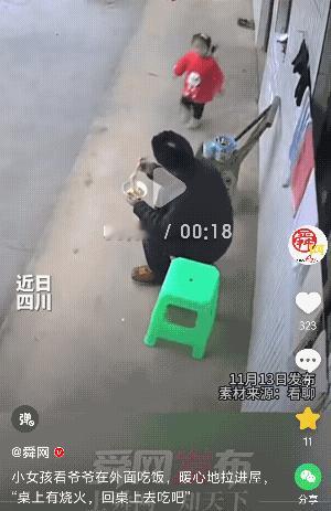 太暖心了,四川,一女娃子见爷爷在外头坐着吃饭,从屋头走到爷爷跟前说:桌子上有烧火,去桌子上吃。这女娃子是怕爷爷冷着了,真是贴心的小棉袄… 一爷爷在屋外边坐着吃饭,就在这个时候,从屋头里走出来一穿着红色衣服的小女娃,一步一步向着爷爷走过来。 到爷爷跟前时,奶声奶气对着爷爷说:桌子有烧火,在桌子上吃。 不知道是不是爷爷耳背还是孩子说话不是很清晰,所以爷爷轻轻的问:桌子上吃? 女娃子回到爷爷:嗯。爷爷回道:哦,要得。 女娃子一边向屋里头走去,一边回头看向爷爷说:走 ,走,走,走,走… 看见爷爷还坐着不动,她立马回头走向爷爷,拉着爷爷一起回屋里去,这是怕爷爷在外面冷着了。真心善。 这女娃子看着真让人心生疼爱。太懂事了,有网友表示,善良发自骨子里,这家人都尊敬老人,孩子才会这样懂事。 也有网友说,暖心的小宝贝,爷爷肯定平时对她很好。是的呀,孩子的世界其实很纯粹的,谁对她好,她就记得谁好,就愿意跟谁好,跟谁亲近。 这孩子这么小,就这么懂事了,知道疼爷爷。太温暖了,真有孝心,还是个孩子就知道心疼爷爷了。这就是亲情的力量吧。 朋友们,这么暖心的闺女,想不想要一个? 人类幼崽 孩子 爷爷 温暖孙女的暖心话 生活 贴心 孙女 暖心 信息来源 舜网