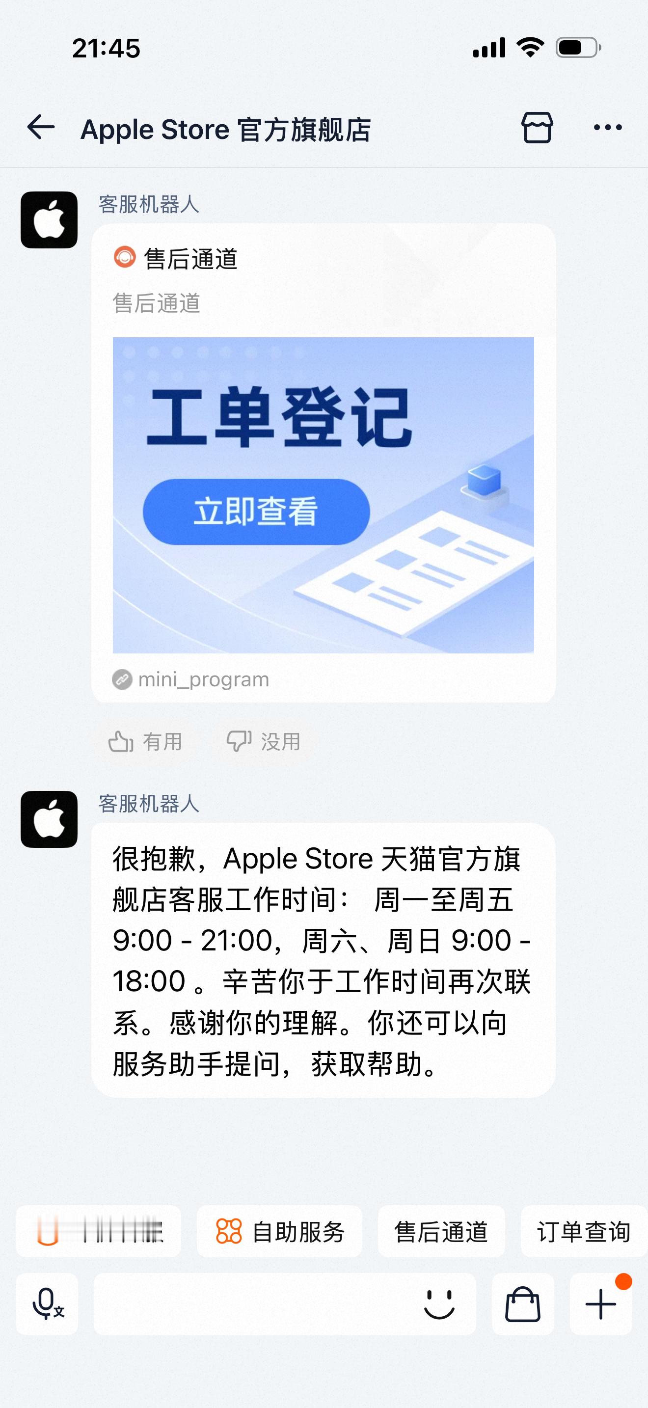苹果天猫店连客服周末都是提前下班这个国内找不到能相比的吧弄不好全是外包客服
