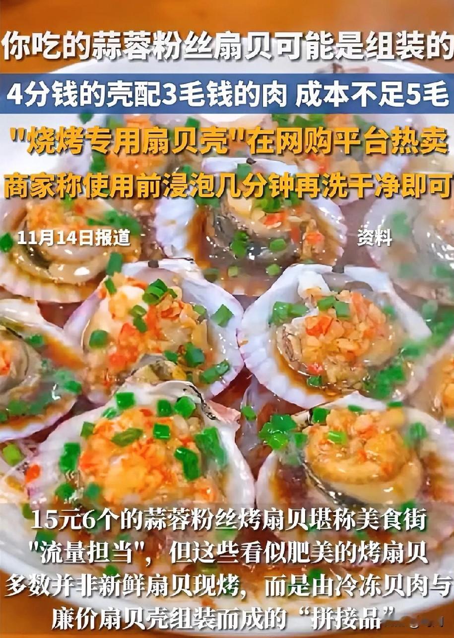 你吃的扇贝可能是组装的?! “烧烤扇贝壳”在网上热卖! 你知道吗?4分的壳➕3毛的肉成本不足5毛钱! 国人还是太聪明了! 什么都是假,只有我们没想到[赞] 商家称壳子会清洗一下[捂脸],洗啥洗啊,那壳都是老员工了,告诉你们个秘密你们吃完舔过的壳,人家直接丢水桶里拿水泡一会,拿来上刷一刷又继续放料继续做下一桌[绝望的凝视]某次借用厕所无意中看到一老阿姨在回收[紫薇别走]