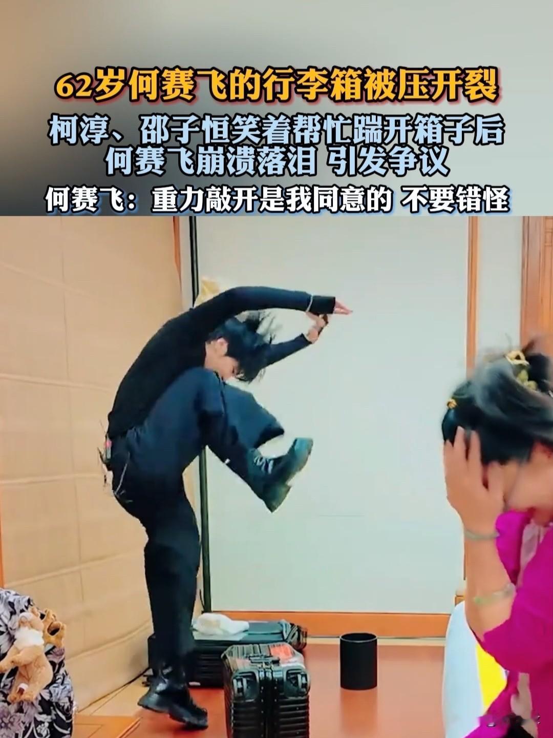 最近一档综艺里,何赛飞的行李箱成了大家讨论的焦点,邵子恒和赵柯淳想帮她打开一个老式密码箱,可箱子锁坏了,怎么也打不开,两人最后拿重物砸,用脚踹,硬是把箱角踹裂了,撬开了,镜头里何赛飞看着这一幕,突然捂住脸哭了,说了一句,什么味道都有,这画面一播出来,网上就吵开了。 第二天,两位男嘉宾赶紧发微博道歉,可事情还没完,何赛飞自己也说了,箱子早就不结实了,锁根本关不上,踹开是她同意的,跟着她二十年的老箱子,被人这么一踹,心里真不是滋味,她特意讲,错不在弟弟们,是她没说清楚,别怪他们。 这事听着不难,可评论区有人问,箱子里到底装了啥,何赛飞说味道复杂,是不是旧物勾起了什么念想,也有人觉得,艺人私下这么护着老东西,反倒显得挺真实。 节目组这么干,说是想制造点冲突,可观众看了心里总不是滋味,谁没几件陪了多年的旧东西,换谁碰上都舍不得,更别说当着全国人的面一脚踢开,何赛飞最后说句心疼弟弟,听着像是在打圆场,可话里话外那点难受,谁都能听出来,谁也不愿自己珍藏的东西,落得这么个下场。