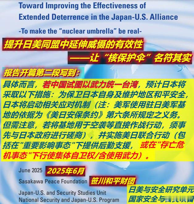 图1:媒体朋友问:咋看昨天高市核言论?图2:我借今年6月日知名智库的一篇报告的内容回答说,还是为武力介入台海做军事准备呗。当然,美国一些人也认为,美国可能在日本部署核武器代表了一项旨在加强地区安全、威慑潜在对手和加强美日联盟的多方面战略。作为外交筹码,使美、日能以优势地位进行谈判影响地区动态。