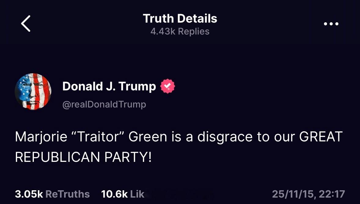 特朗普跟女议员格林彻底翻脸,特朗普用出最严厉的词,“玛乔丽·“叛徒”·格林是我们伟大的共和党的耻辱!”