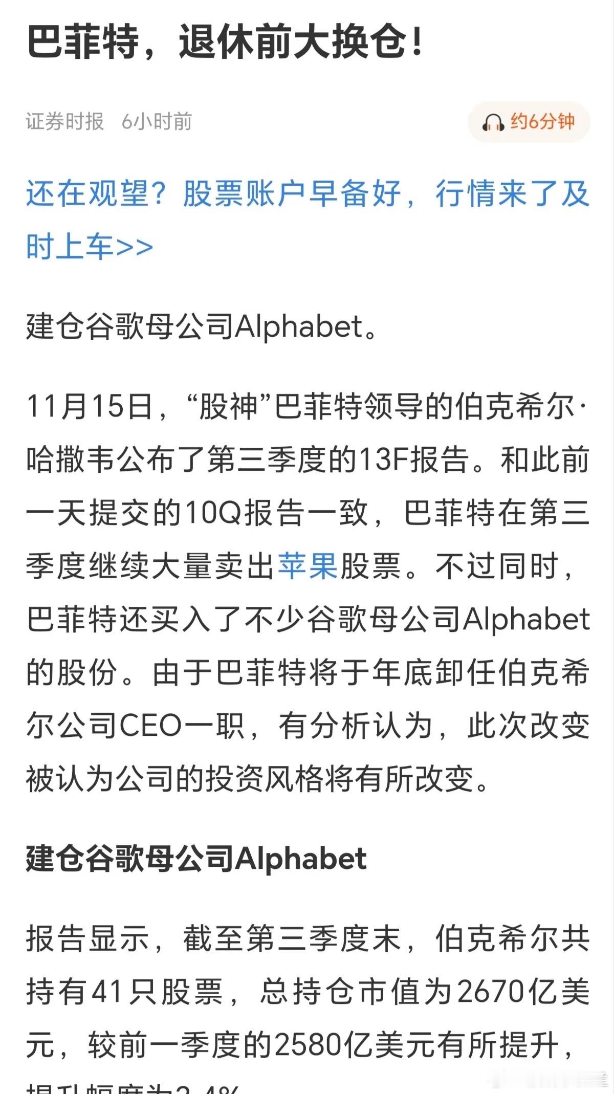 巴菲特退休前伯克希尔调整持仓,加速抛苹果,开始建仓谷歌,释放了什么信号!以前他的投资都专注于传统消费品,并且有很强的护城河的上市公司,对科技的投资一直保持谨慎态度,现在突然向科技AI基础设施转变,是不是也意味着投资观念发生了转变!这给我们普通投资者有哪些启示!1,投资不是一成不变的,是随着环境的改变而改变,从传统消费品到科技AI的转变,也在说明,要跟着趋势走。2,不管是传统消费品,还是科技AI,都需要研究长期竞争力,在合理估值的时候买入,才能提高赚钱的概率。