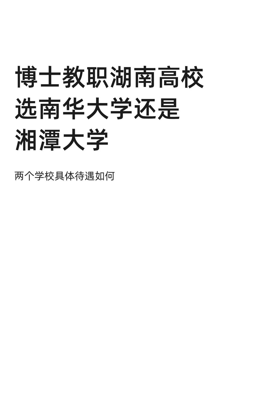 博士教职湖南高校 南华大学还是湘潭大学 工科专业生物方向。想去企业没企业要。奈何找了高校。两所学校待遇应该都差不多。但是南华有平台有个师姐在那,仪器平台都有。湘潭大学院长要我的意愿更加明确,而且是双一流。但需要过去给他们补充新的方向,需要搭建新的平台。怎么选啊?两个学校具体待遇如何啊。高校教师 青年教师 高校求职