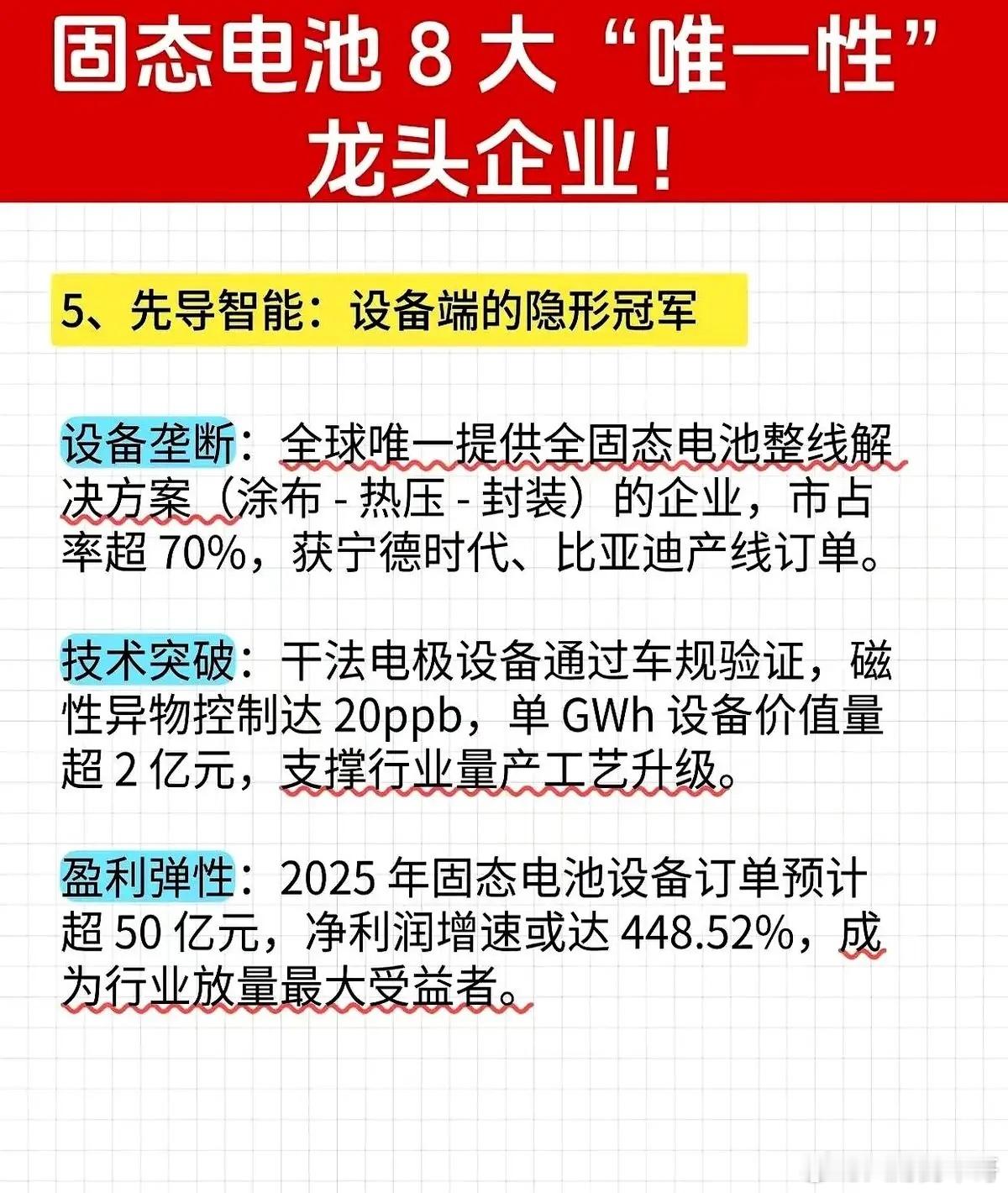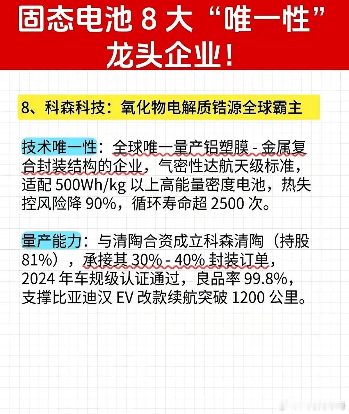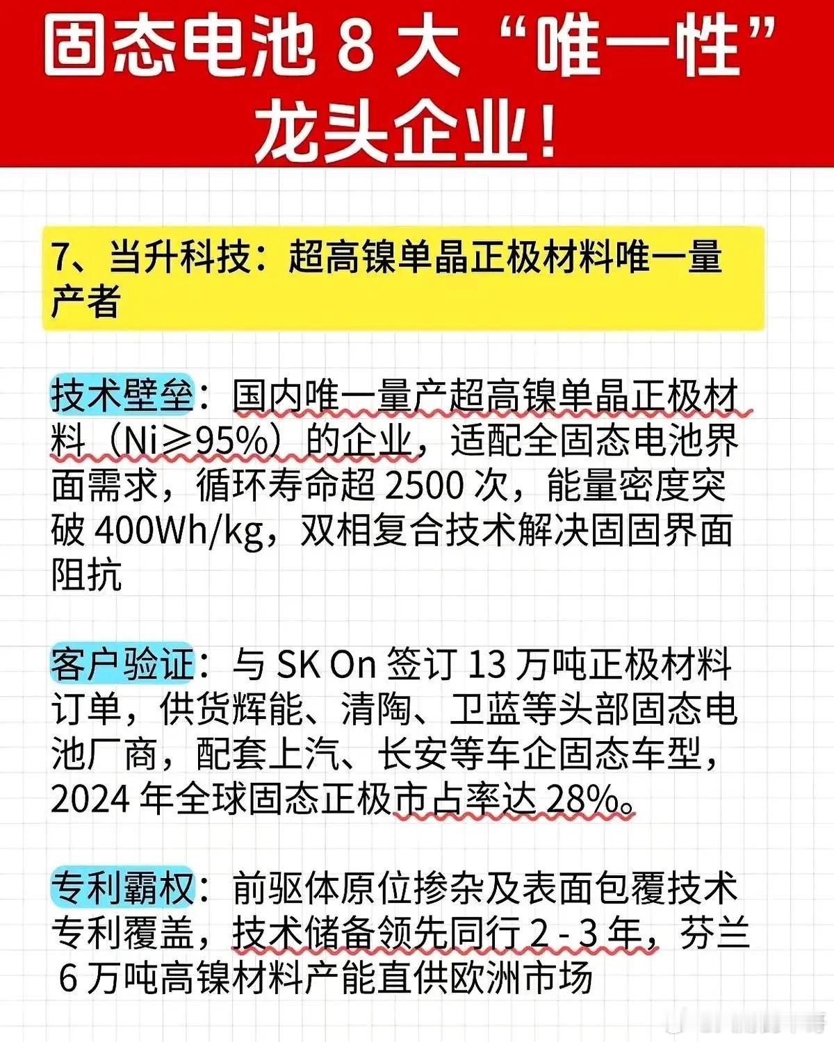 全球唯一。又是全球唯一。我跟你讲,最近刷到好几个这样的公司,清一色都是自己人,全是在固态电池这个新战场上。什么感觉?就感觉一群人一声不响地,直接把未来的高速公路给修好了,而且收费站只此一家。比如那个叫上海洗霸的,搞氧化物电解质,直接干到了“全球唯一吨级量产”,良品率98%以上,还供货比亚迪。这不是PPT,不是实验室样品,是吨级的,是已经塞进车里跑起来的东西。还有搞正极材料的,搞封装结构的…个个都是“国内唯一”、“全球唯一”。真的,有时候你不得不佩服。闷声发大财,是老祖宗传下来的手艺。但现在,是闷声干大事。当别人还在为某个技术路线吵得不可开交时,我们这边已经把整个产业链上最硬的骨头,一块一块啃下来,还做成了独家秘方。这已经不是什么“弯道超车”了。这是直接换了条赛道,然后把裁判和规则制定权,都默默地攥在了自己手里。别老盯着那些虚头巴脑的概念了,真正的护城河,是这种写在专利和产线上的“独一份”。这玩意儿,比任何故事都让人心潮澎湃。