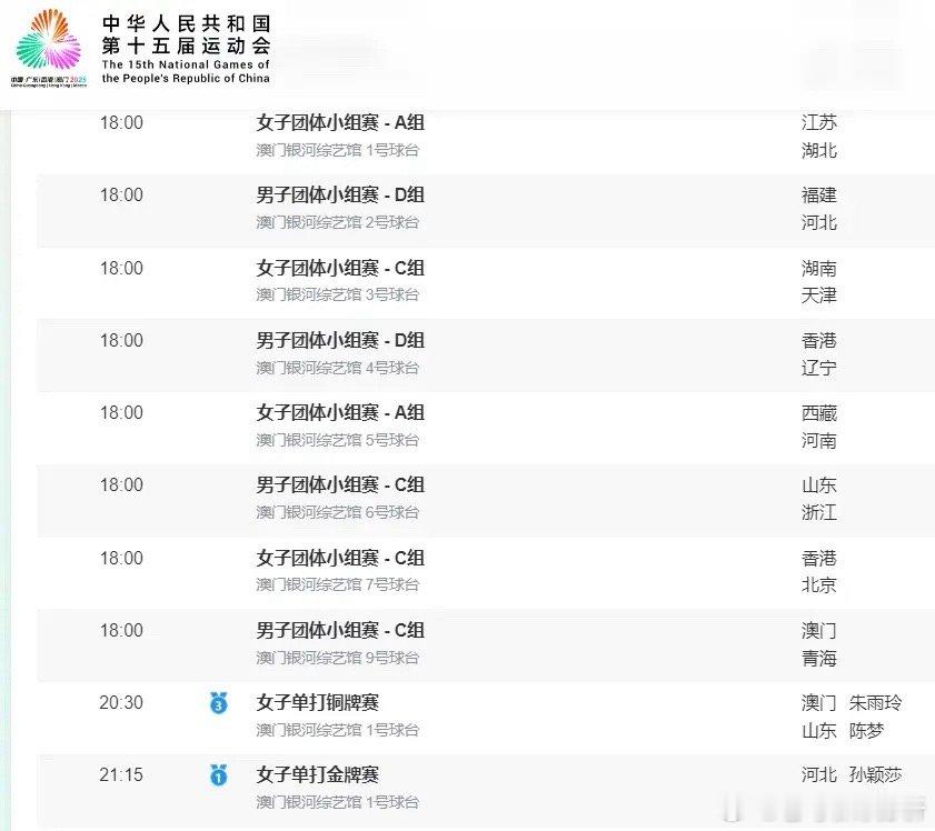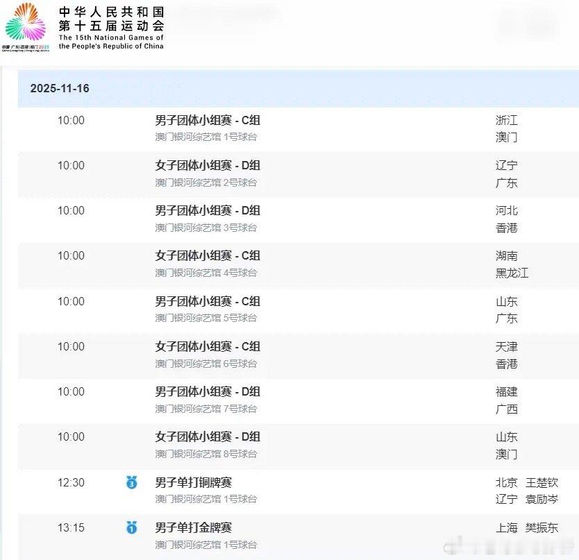 全运会11月16日乒乓球赛程:16场团体赛+4场单打,产生两冠 11月16日,2025年全运会将进行20场乒乓球比赛。其中有16场团体赛,以及4场单打比赛,产生两冠。上午10点将进行八场团体小组赛的比赛。其中有四场男团小组赛和四场女团小组赛。场男团小组赛分别是C组的浙江队对阵澳门队,D组的河北队对阵香港队,C组的山东队对阵广东队,D组的福建队对阵广西队。可以重点关注山东队与广东队,河北队与香港队的比赛。四场女团小组赛分别是D组的辽宁队对阵广东队,C组的湖南队对阵黑龙江队,C组的天津队对阵香港队,D组的山东队对阵澳门队。可以重点关注辽宁队与广东队的比赛。12点30分进行男单铜牌战,由王楚钦对阵袁励岑。王楚钦在半决赛中输给了樊振东,不得不参加铜牌战。这自然不是他期望的。不过事已至此,他不得不打铜牌战。虽然铜牌战不如金牌战,但王楚钦也需要认真对待。铜牌也是牌,可以登上领奖台。再说了,如果王楚钦输给袁励岑,面子上会挂不住。而袁励岑也想获得奖牌,实现突破。两人都会尽全力比赛。这场比赛也会很精彩。13点15分进行男单金牌战,由樊振东对阵林诗栋。林诗栋又能跟自己的偶像樊振东比赛了。自巴黎奥运会后,樊振东就没进国家队,也就没有参加过重要的赛事。不过樊振东依然保持非常高的竞技状态。他战胜了王楚钦,就是最好的证明。反观林诗栋,自从2月份他夺得WTT新加坡大满贯的男单冠军后,就再也没夺得过男单冠军了。他经历了九个月的男单冠军荒。林诗栋现在遇到了瓶颈期,而且心态出了问题,信心不足,难以打硬仗。他以前跟樊振东多次交手,绝大多数输了,处于绝对的劣势。这场男单决赛,看好樊振东获胜。晚上18点进行八场团体小组赛,也是四场男团小组赛+四场女团小组赛。四场男团小组赛分别由D组的福建队对阵河北队,D组的辽宁队对阵香港队,C组的山东队对阵浙江队,C组的青海队对阵澳门队。四场女团小组赛分别由A组的江苏队对阵湖北队,C组的湖南队对阵天津队,A组的西藏队对阵河南队,C组的北京队对阵香港队。可以重点关注北京队与香港队的比赛。20点30分进行女单铜牌战,由陈梦对阵朱雨玲。陈梦在半决赛中输给了王曼昱,朱雨玲在半决赛中输给了孙颖莎,不得不去争铜牌。两人实力都很强。这场铜牌战会很激烈。陈梦休息了太长的时间,状态自然下滑了不少。朱雨玲的状态要好一点。她会占据一点优势。21点15分进行女单金牌战,由孙颖莎对阵王曼昱。海产姐妹时隔四年再次会师全运会女单决赛。2021年全运会,王曼昱战胜孙颖莎,夺得女单冠军。孙颖莎屈居女单亚军。四年过后,孙颖莎的状态更好了,达到了球员生涯巅峰期。两人今年多次交手,而且基本都是打决赛,孙颖莎赢的次数多了很多。看好孙颖莎夺冠。算起来16日有16场团体小组赛,2场铜牌战,2场金牌战,共计20场比赛,产生两冠。期待精彩的比赛。
