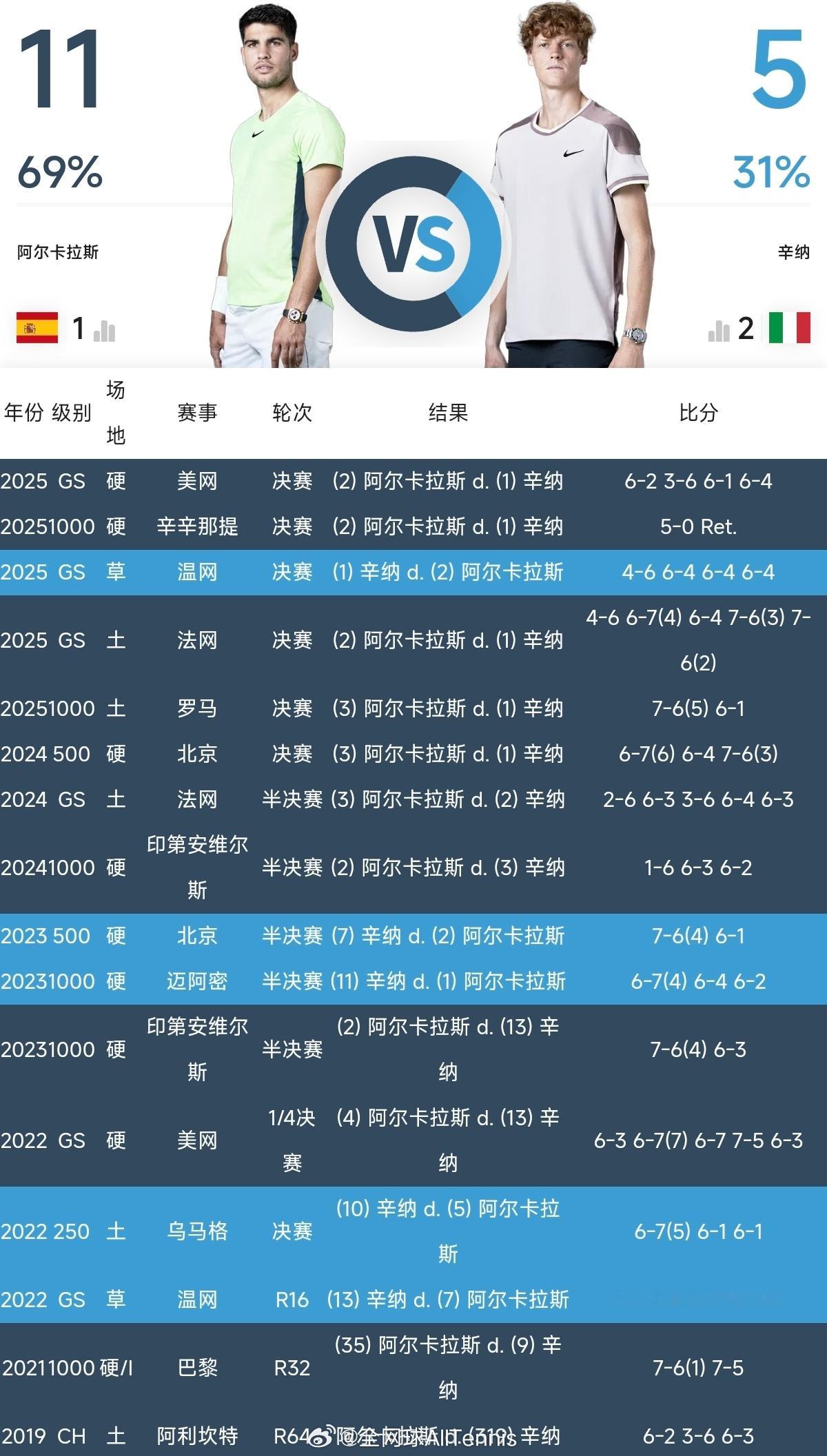 男单决赛竞猜:关注我们,以转发的形式,竞猜『阿尔卡拉斯🆚辛纳』的『胜者+双方总得分(技术统计里的total points won)』,最先猜对两题的一位粉丝将获得随机网球周边奖品两份❗(若两题无人同时答对,优先选择答对胜者且另一最接近者)活动截止时间比赛开始前。