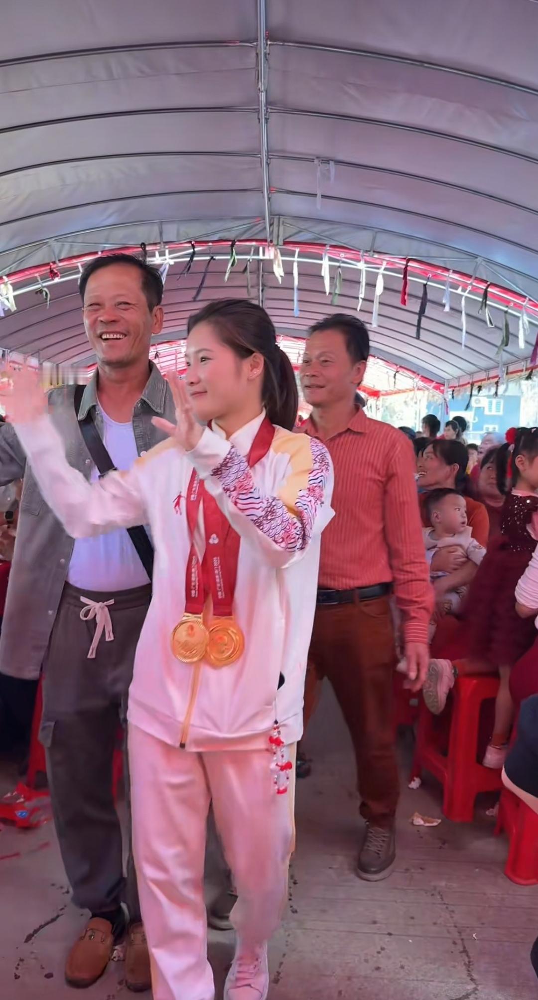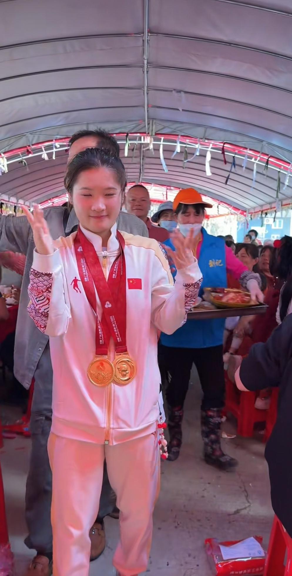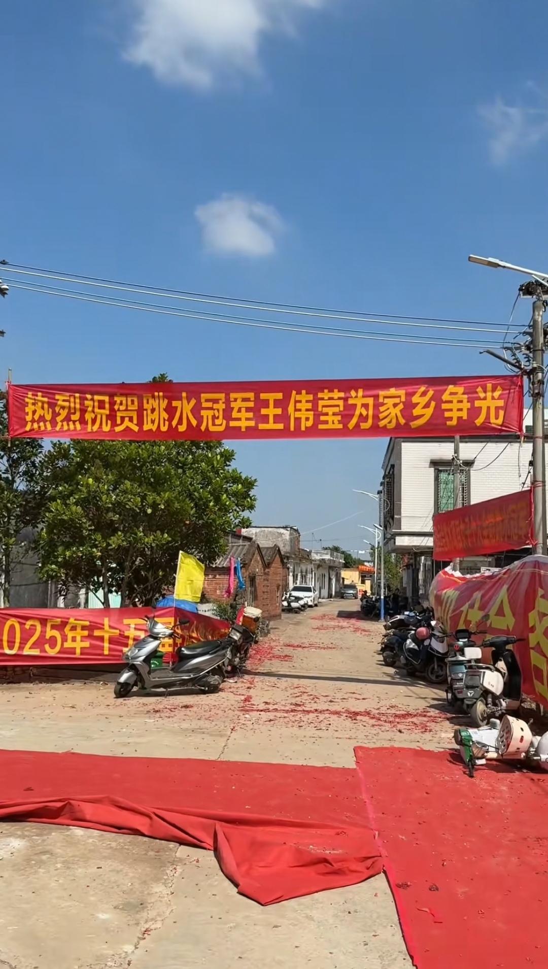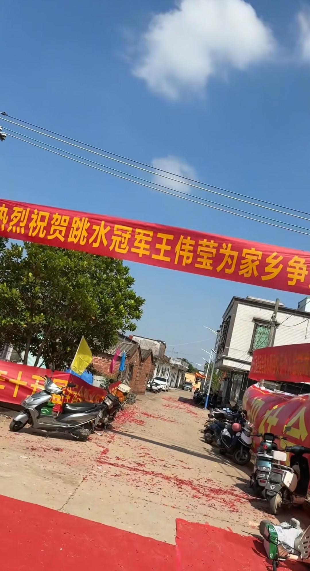 11月15日,王伟莹回农村老家了,她穿着白色运动服,脖子上挂着两枚金牌,村里为她接风。 村里拉了横幅“热烈祝贺跳水冠军王伟莹为家乡争光”,铺了红毯,搭了帐篷,摆了酒席,庆祝王伟莹获得冠军。 王伟莹回到家村里,和大家热情打招呼,在这喜庆的日子里,村里也专门放了鞭炮庆祝。