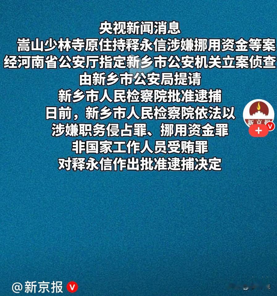 释永信被批准逮捕 曾经风光无限的少林CEO,现在被正式批准逮捕了…… 嵩山少林寺原住持释永信挪用侵占项目资金寺院资产,长期与多名女性保持不正当关系并育有私生子 日前,新乡市人民检察院依法以 涉嫌职务侵占罪、挪用资金罪、非国家工作人员受贿罪,对释永信作出批准逮捕决定…… 利欲熏心,顶风违纪,这般行径既是对规则的践踏,更是对信任的背叛,,对于打着宗教幌子犯罪必须严惩不贷,绝不姑息……