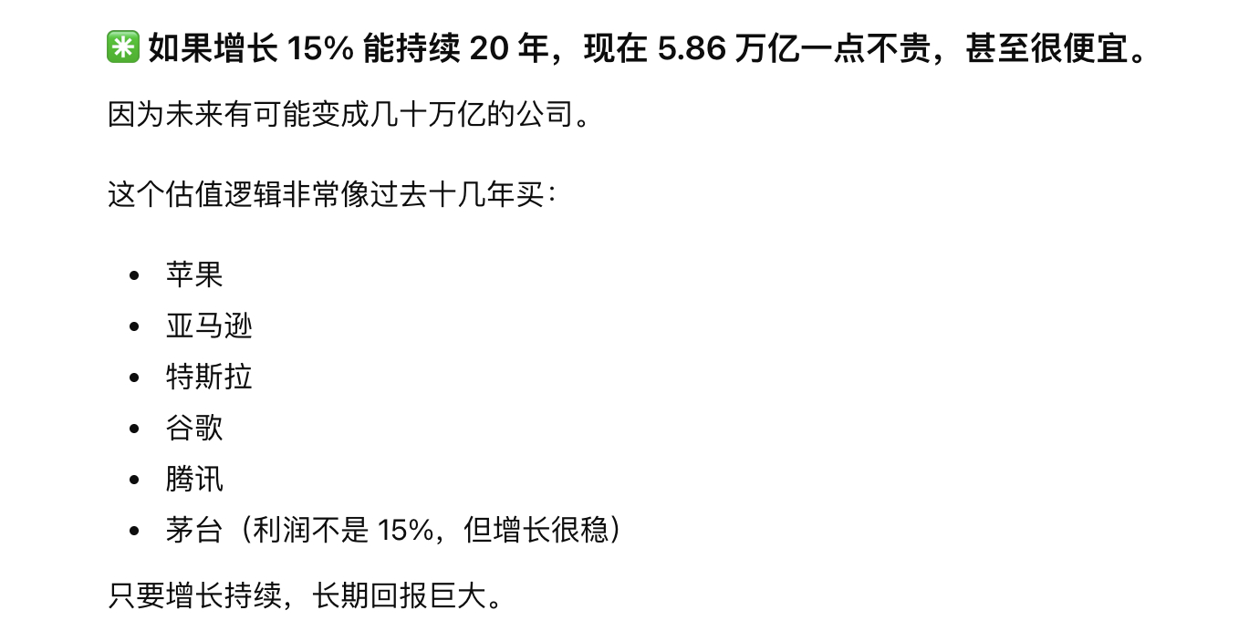 把段永平这段话放到 GPT 分析了一下,然后随机找几个公司的真实财务数据放进去再分析一下,放到腾讯的时候(我假设了腾讯年利润增长 15%,实际更高),GPT 自己给出了几个类似估值逻辑的公司。包括:谷歌、苹果、亚马逊、特斯拉、腾讯和茅台。这尼玛大部分就是段永平买的几个公司。所以他还真是严格践行自己的投资逻辑。