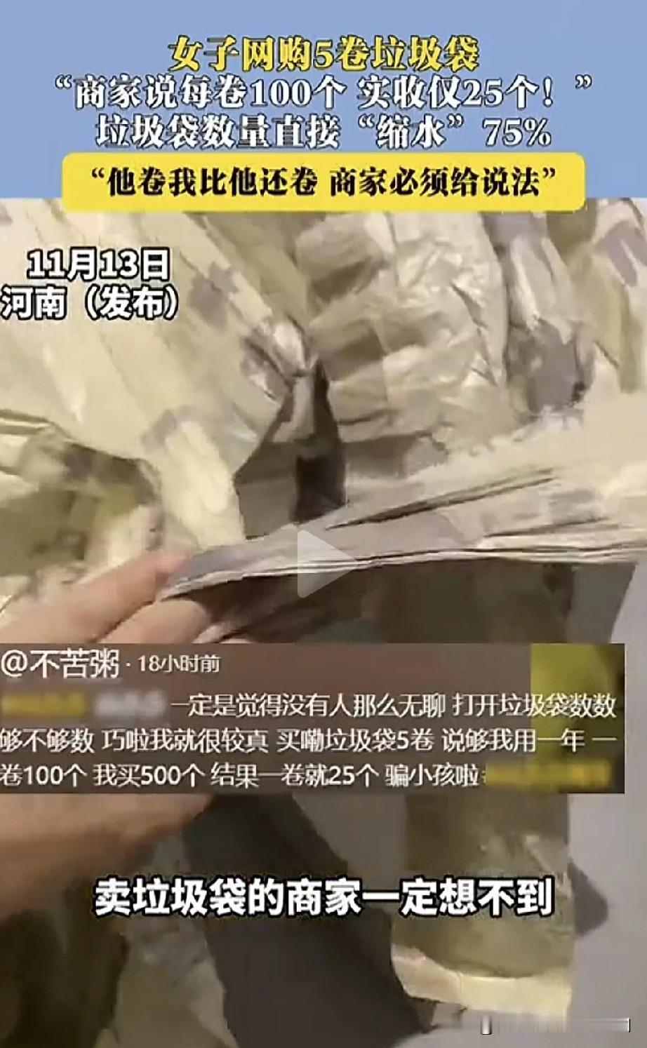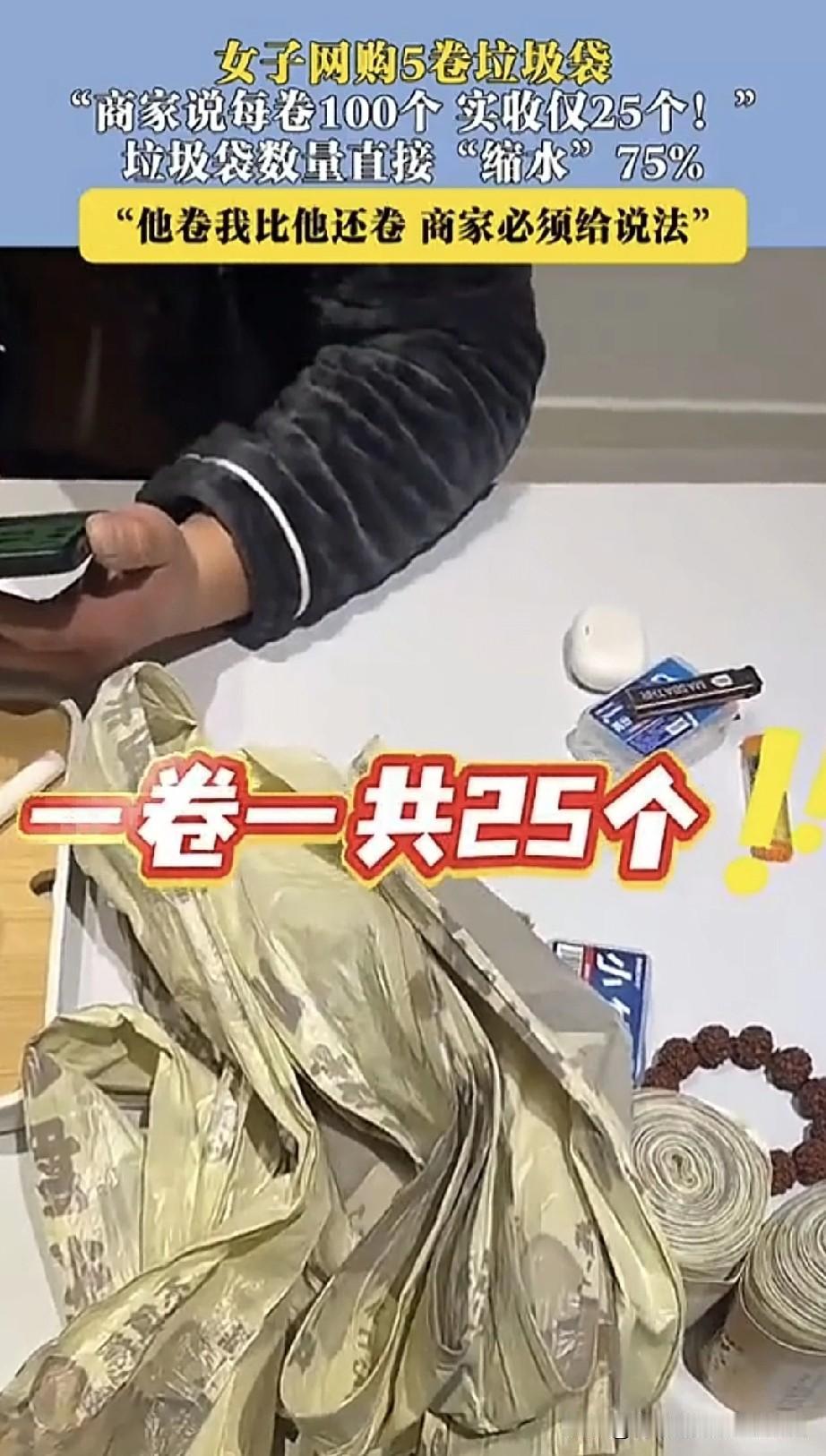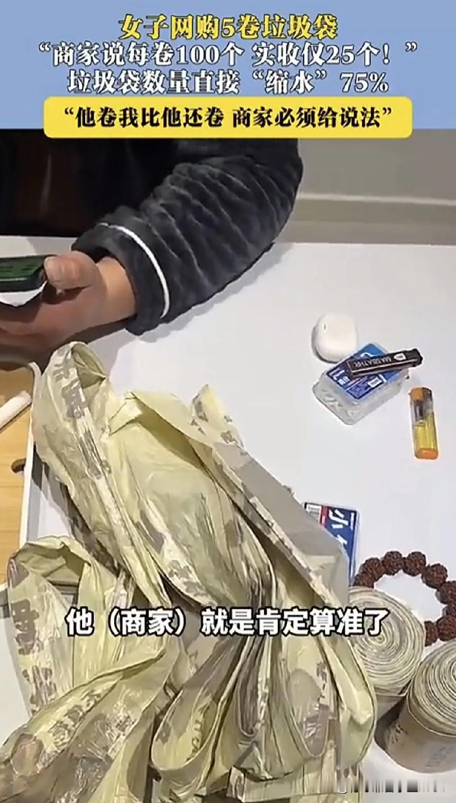 女子发视频曝光售卖垃圾袋的商家。据女子介绍,她在网上直播间看到主播推销,19.5元能买五捆垃圾袋,主播还称每卷垃圾袋有100个,五卷能用一年。女子轻信了主播的话,便下了单。 收到货后,女子心生怀疑,打开一卷垃圾袋逐个清点,发现每卷仅有25个。商家本以为买家不会拆开查看,却不料碰到了如此较真的女子。垃圾袋数量直接减少了75%,女子表示一定要讨个说法,要么退货,要么商家道歉。 商家是不是算准了100个人里只有一两个人会拆开检查?即便给这几个人退款,他们也照样能盈利。 这都是套路。我也有过类似经历,具体花了多少钱记不清了,同样是五卷,宣传每卷100只。我闲来无事拆开一卷数了数,结果一卷只有50只。我联系客服,人家二话不说就要给我退一半的钱,我没同意,质问他们老老实实做生意不好吗?他们销量有几万单,这得骗了多少钱。我要求全额退款,结果秒退。 大家有过类似的经历吗?