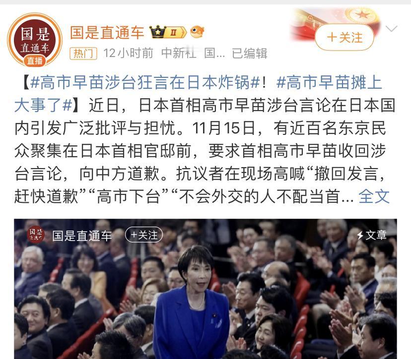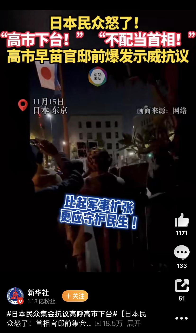 我们媒体报道日本民众集会抗议高市早苗,虽然值得高兴,但没必要过度关注。 原因就在于集会规模也就几十人,这种情况在一个民主国家是非常正常的,几乎每天都会发生,所以我们不要把它当作日本民意的主流,甚至认为日本人都和我们的立场一样而沾沾自喜。 这样想的话,就等于误判了中日关系,也误判了日本国内政局。 日本的几大民调都显示,高市早苗内阁的支持率是20年来日本政坛最高的。她上台之前在台海局势上就有出格表现,这说明大部分日本人对此并不在意,不然她怎么会有60-70%的支持率? 中国更应该关注的是如何有效反制,让高市早苗长记性。而不是寄希望于在短期内改变日本民意。