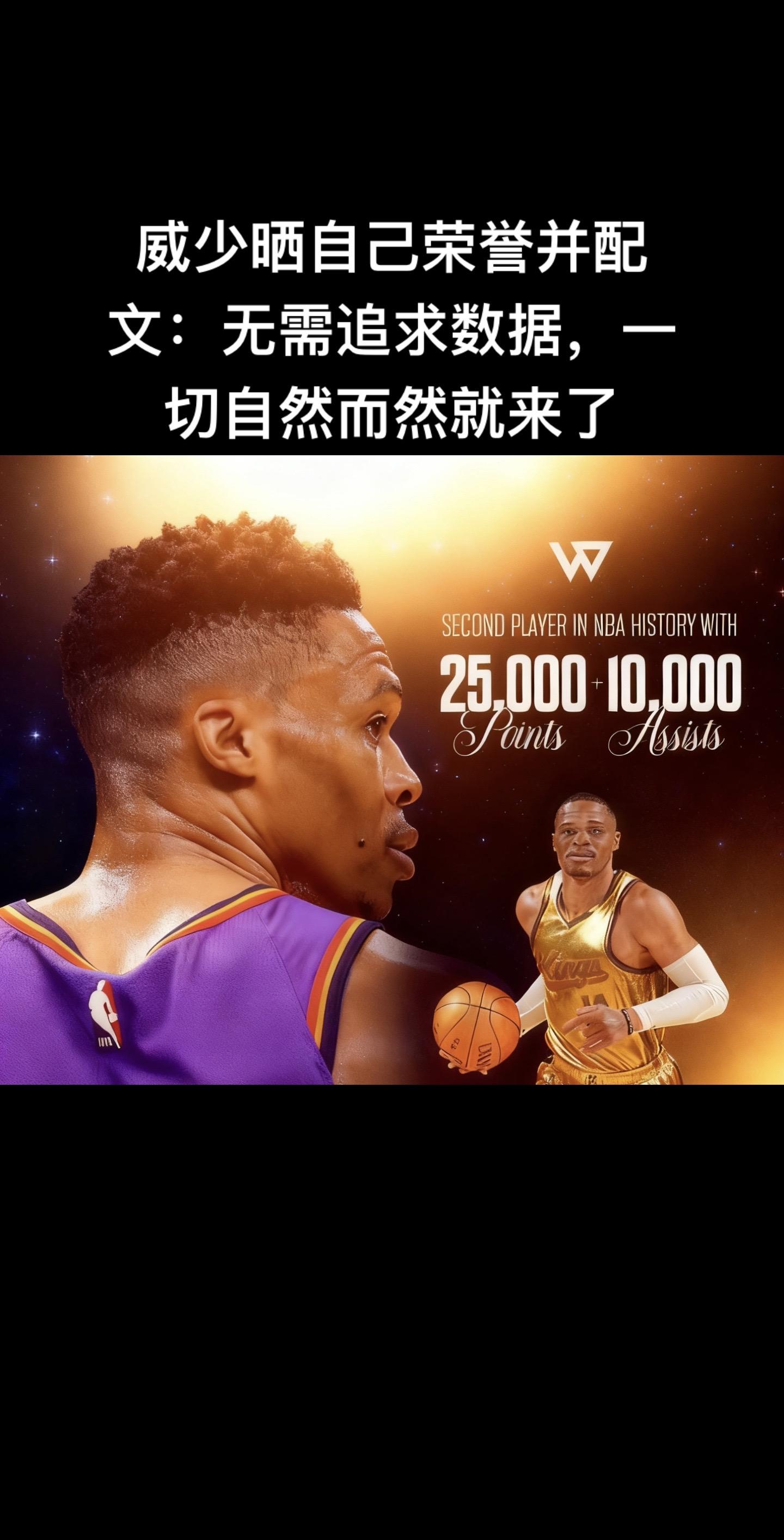 威少在NBA杯国王对阵森林狼的比赛中,生涯总助攻数突破10000次,就此成为继詹姆斯之后NBA历史上第二位达成25000分+10000助攻的球员 。 随后他在个人INS上晒出了纪录海报,配文是“无需追逐数字,唯有追随本心的喜悦。一切便水到渠成,始终心怀谦卑,满怀感恩” 。这番话既契合他此次达成的里程碑,也和保罗·乔治此前评价他“数据从不是他的追求”的说法相呼应。威少篮球来nba篮球🏀mrd先生