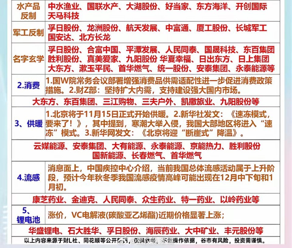 11.17周一盘前 市场热点和投资逻辑!1.水产品2.军工反制3.大消费+水产品+预制菜4.流感医药5.供暖寒潮6.锂电池相关