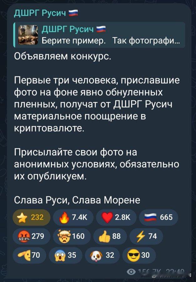 为了将乌克兰去“纳C化”。俄军“鲁西奇”部队宣布举办“处决乌克兰战俘最佳影片比赛”:前3名发送明显‘归零’战俘的照片,将获得加密货币奖。