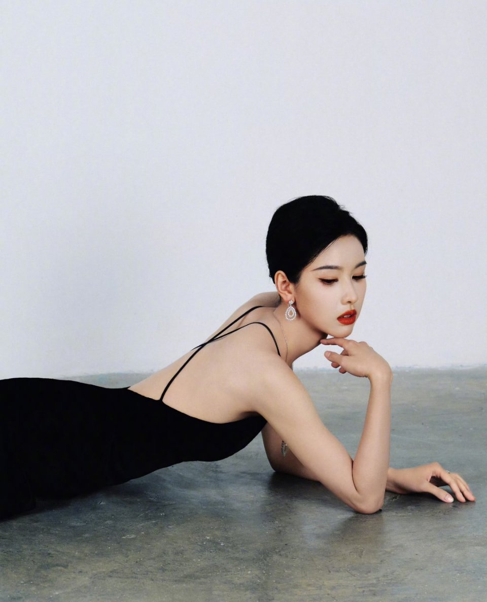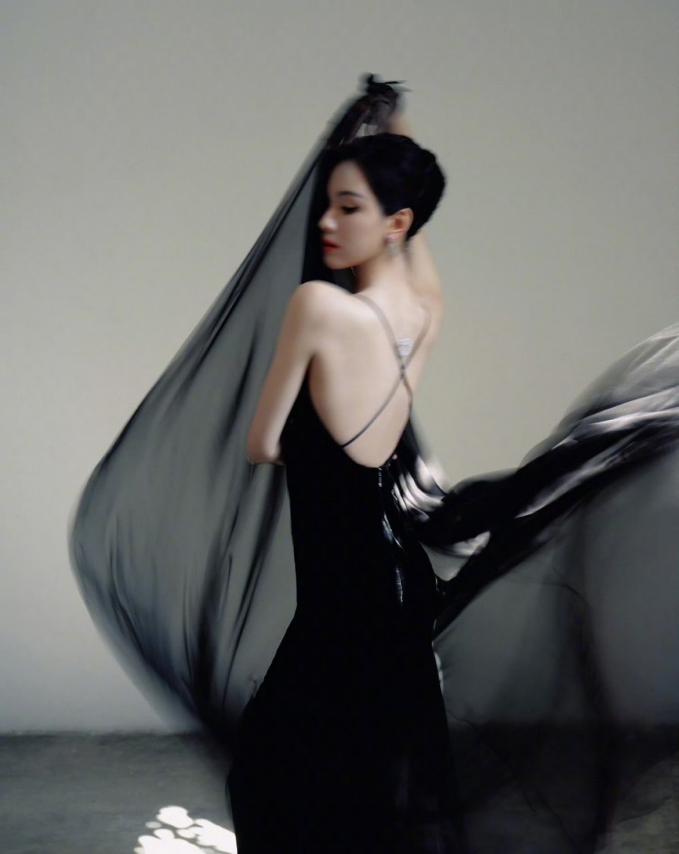 陈都灵金鸡奖的黑裙造型堪称红毯“冷感优雅”天花板!一袭SHINE MODA哑光黑缎与半透黑纱拼接吊带裙,将“黑天鹅”的矜贵与疏离感演绎到极致,窄肩吊带勾勒出干净利落的肩颈线,背部交叉系带在白皙肌肤上织就精致线条,蝴蝶骨若隐若现,薄如蝉翼的裙摆随步伐轻扬,恰似暗翼舒展,灵动又不失沉稳。她的身材纤细却不单薄,侧面轮廓如裁纸般利落,冷白皮与哑光黑形成强烈反差,衬得肌理通透发光。妆发更是点睛之笔,冷调眉峰搭配焦糖色眼尾晕染,红唇精准定焦,水滴形满钻耳坠与黑网纱手套相映成趣,既添星光点缀,又衬得气质清冷疏离。不管是俯身时的“美人鱼趴岸”姿态,还是与关晓彤同框时的明暗碰撞,她都以克制的动态管理、恰到好处的细节拿捏,打破了“清纯小白花”的固有标签,把瘦金体般的凌厉与书卷气完美融合,每一幕都自带电影质感,成为当晚最让人难忘的红毯名场面。