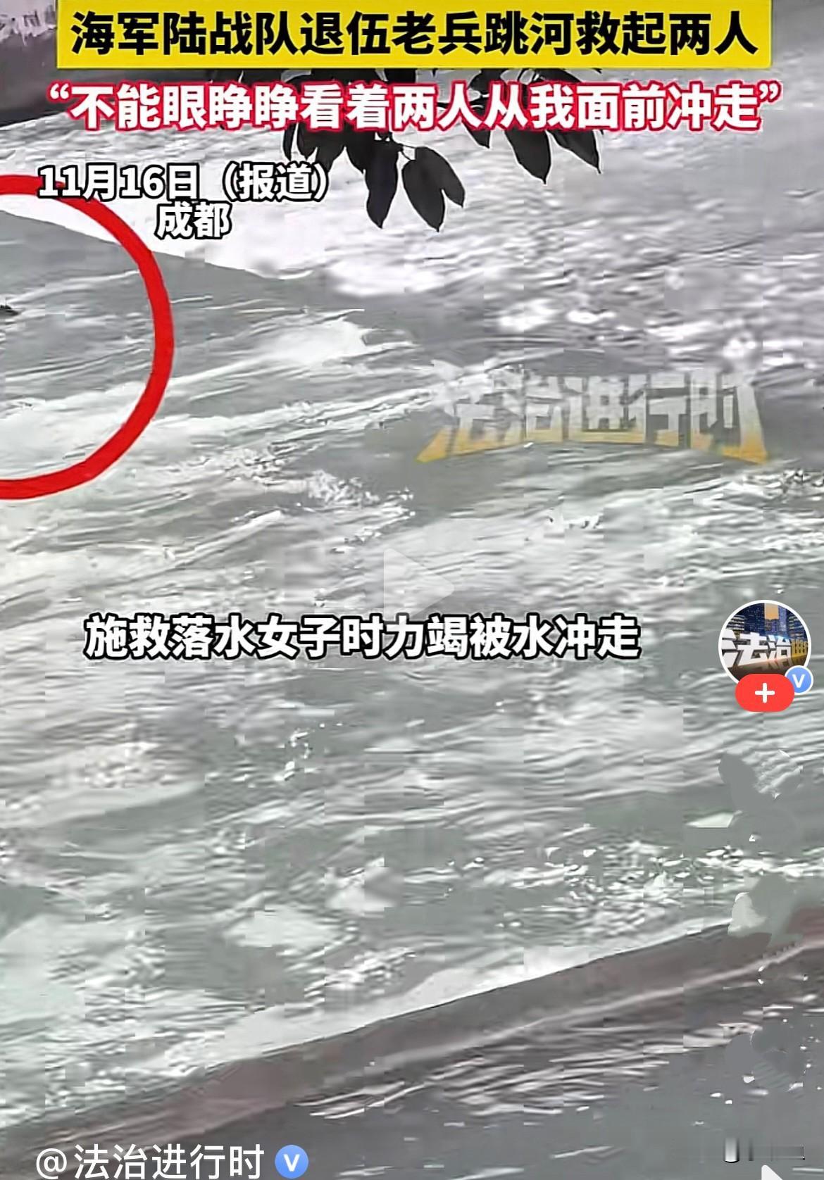 近日,成都九眼桥上演了一场救人接力赛…… 张先生是名海军陆战队退伍军人,现在是一名快递员,还没到快递的时间,他在桥边跑步,看到一女子落水了,一黑衣男子跳进河中施救,张先生观察地形后,拿着救生圈就到下游去施救了…… 情况紧急,黑衣男子体力不支被急流冲走了,张先生一只手用救生圈圈住女子,一只手抱着黑衣男子,后和消防队员一起将两人救出…… 张先生说我应该挺身而出,我不能眼睁睁的看着两个人从我面前冲走…… 军人本色,退伍不褪色…… 为善良勇敢救人的帅哥们点赞,传播正能量,好人好报……