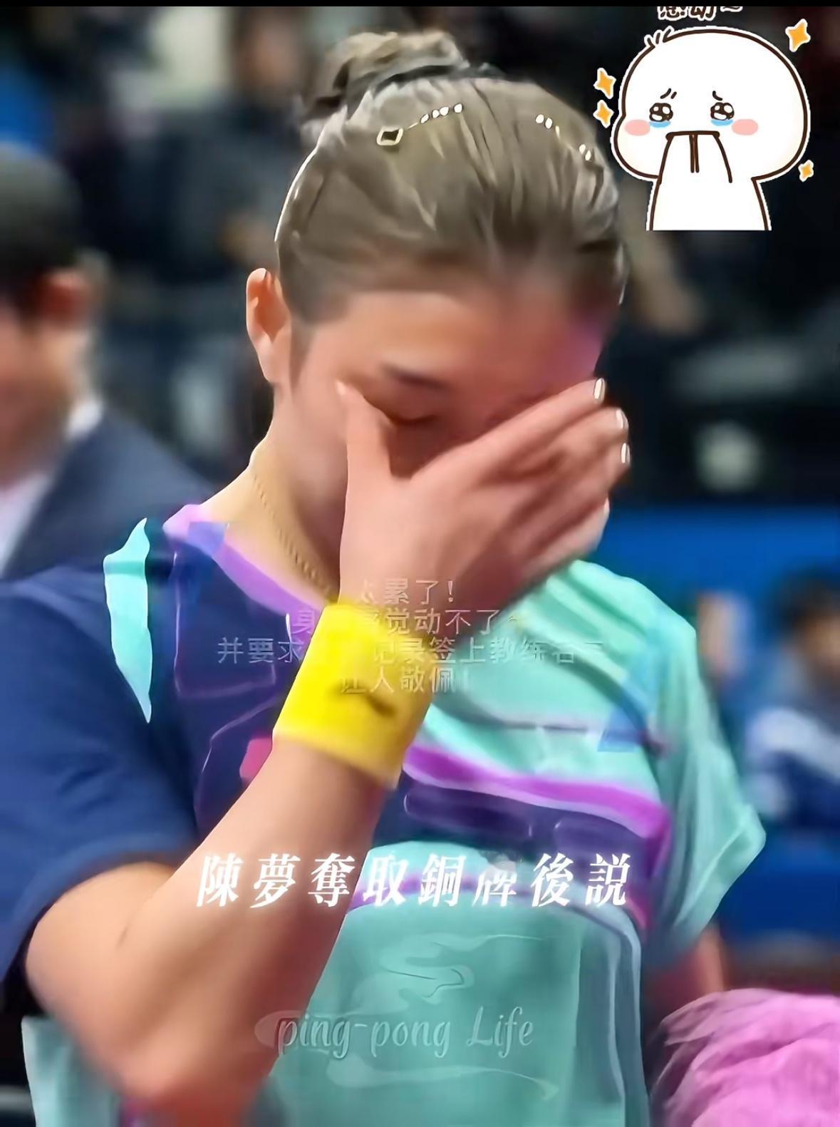 陈梦4:1朱雨玲后感觉太累了 身体动不了了,并要求比赛记录上签上 教练的名字! 让人敬佩! 九个月没有比赛, 归来仍然和莎莎曼昱站在一起, 山东队非常宠她, 不强制她训练, 但运动员争强好胜的精神依然存在, 只要站在赛场上, 就想赢下比赛, 拿下朱雨玲, 身体已经达到极限, 陈梦有自己的人生规划, 祝福她!
