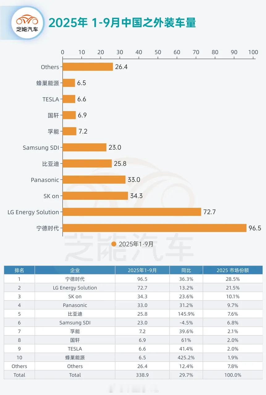 在分析中国电池企业为啥在全球占据领先优势,规模是个核心要素。根据SNE的数据今年 1—9 月,除中国之外的电动汽车全球市场电池使用量为 338.9GWh,同比增长 29.7%。韩系“三兄弟”(LGES、SK On、三星 SDI)合计份额跌到 38%,同比下降 5.4 个点,欧美车企的销量恢复不均衡(韩系电池的“主场优势”正在被中国企业通过本地化和性价比侵蚀),以及中国电池企业在欧洲和北美加速本地化。有几点变化值得关注:◎ 三星 SDI 受到 Rivian 车型切换 LFP影响,份额被稀释;但随着奥迪 Q6 e-tron 放量,后续仍有增长空间。◎ SK On 依赖现代、奔驰、大众,美国工厂的爬坡仍有压力,后续能不能靠 LFP/LMFP 大规模量产翻盘,要看 2026 年之后。◎ LGES 的压力最直观:特斯拉需求疲软导致其供货量下降 25%,但起亚 EV3 和通用 Ultium 系列给它带来新的支撑。中国企业在全球市场越来越强,依托本土市场的规模和技术迭代比别人快,中国一个月的量和全球1-9月的量也可以比较了,这个需求拉动效应非常直接。◎ 宁德时代增长 36.3%,◎ 比亚迪更是暴涨 145.9%(全球市场出口),特别是在欧洲,比亚迪 1—9 月电池使用量同比飙升 246%,出口车型正在获得更大市场份额。