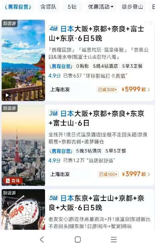 有网友反应,官方提醒赴日安全风险后,携程、飞猪等平台仍在首页力推赴日旅行团,对警
