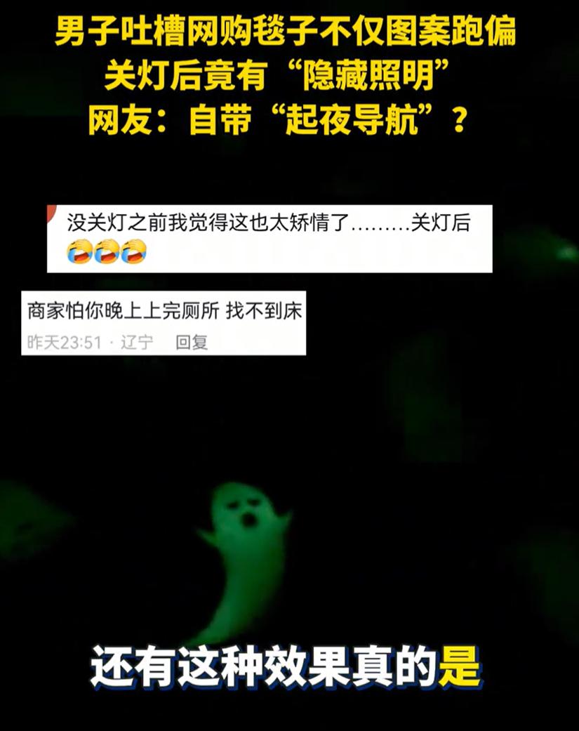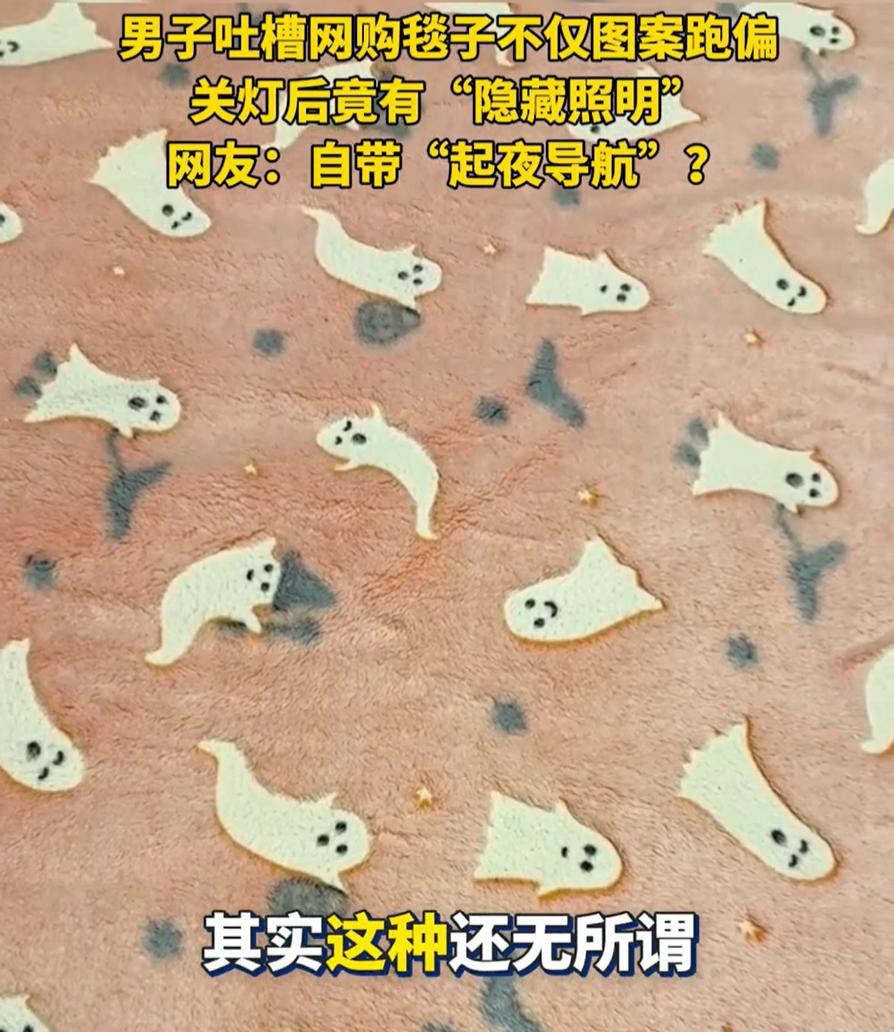 河北,一男子网购时看到一个小毯子不错,就下单购买了,可收到货后,却发现不仅颜色和图案不一样,晚上关上灯后更是被吓了一跳,图案竟然有荧光的效果,看上去感觉怪怪的,男子:我想举报这个卖家! 男子介绍,他当时在网上看中了一款灰白色图案的居家毯,觉得简洁又实用,就下了单。满心期待等来了快递,打开一看却有点懵:毯子不是他想象中的灰白色,而是粉色的,上面还印着一些“小幽灵”造型的图案。他本来觉得,颜色和图案虽然和预期有差距,但也不算大问题,懒得退换,就将就铺在了床上 没想到,真正的“惊喜”出现在晚上。一关灯,周围暗下来,毯子上那些原本不太起眼的图案,竟泛出幽幽的绿光,原来这些图案是荧光材质做的。在黑暗里盯着这些发光的小幽灵,他越看心里越别扭,最后实在忍不住,把整个过程录成视频发到了网上,还表示想举报卖家 不少网友看后也纷纷表示有类似经历:有人买的衣服晚上会反光,有人收到的玩具莫名发光,大家都觉得,这种未事先说明的“隐藏功能”,实在让人不太舒服 其实说到底,这件事的关键并不在于荧光图案本身,而在于商家没有在销售时明确告知。如果卖家在页面上写清楚“部分图案含荧光效果”,或许就能避免这样的误会。消费者要的不是多么高端的产品,而是商品和描述一致、信息透明的购物体验 当然,作为买家在网购时除了看图片和价格,最好也多留意一下商品描述里有没有特别说明,或者翻翻买家的评价和实拍图。有时候商品介绍图片是一个样,可下单时又有其他选择,一不注意,可能就选错了