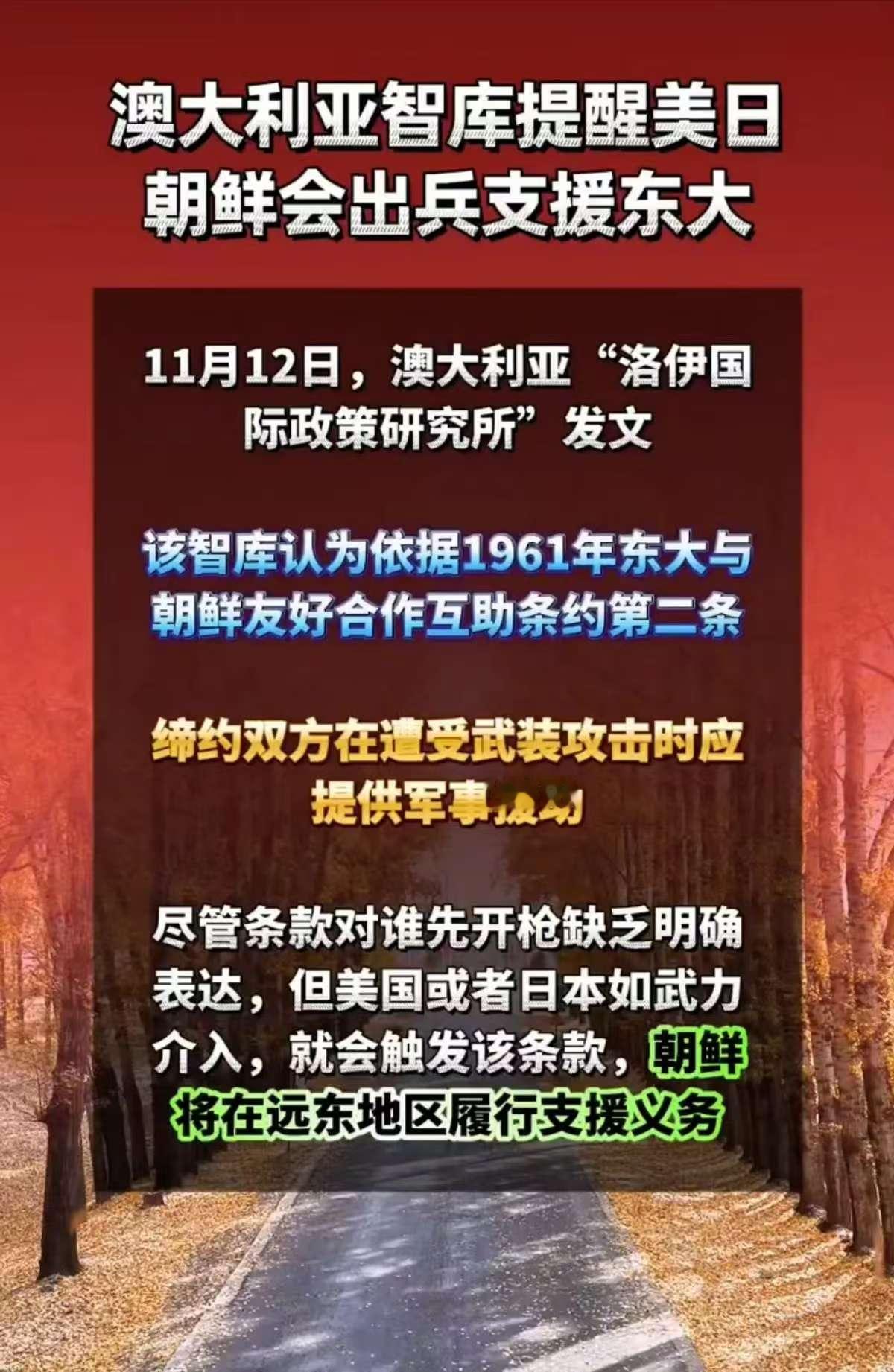 针对日本高市早苗的涉台不当言论,澳大利亚智库给出了提醒!他们表示若是日本武力介入台海,朝鲜必参战!日本武力介入将会自动触发“中朝友好合作互助条约”中的共同防御条款。 说白了,难怪之前,高市早苗想要与朝鲜领导人会晤的时候,朝鲜选择避而不见,甚至是朝鲜的媒体上发表了一篇,痛批日本侵略行为的文章,并表示要对日本进行“百倍奉还”。 这也表明了朝鲜的立场,同时也暴露出日本现如今的处境,可谓是孤立无援,要知道,除了朝鲜以外,俄罗斯那边也对日本有所不满。 毕竟俄罗斯是二战的战胜国,而日本却企图用干涉中国台海问题的言论,淡化自己战败国的身份,这无疑让俄罗斯感受到他们正在破坏二战之后的国际秩序,所以俄罗斯在近期已经严厉表示禁止日本人入境。 其实对日本最重要的美国也早就表明了不会帮助日本,此前特朗普在高市早苗惹恼中国的时候,就表示许多盟友并非朋友,就是告诉日本,若是执意要惹怒中国,那么美国将会与日本进行切割。 说到底,台湾问题属于中国内政,日本此次的不当言论,已然让他们受到了世界各国的孤立,希望他们能够尽快向中方道歉,并声明不会干涉中国的台海问题。