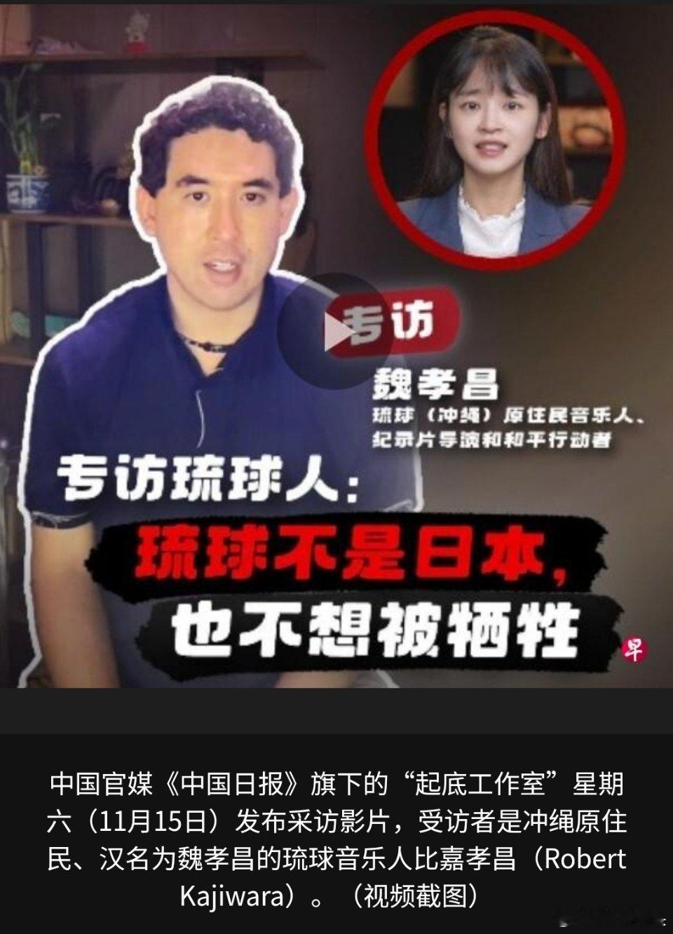 日本首相高市早苗11月7日发表“台湾有事”论后,中国官媒《中国日报》旗下的“起底工作室”发布影片,再掀起“琉球地位未定论”的讨论。影片引述一名冲绳(琉球)原住民称,高市的言论“几乎等于对中国宣战”,冲绳人对此也很担心。冲绳原住民续称,日本对琉球进行殖民统治,但二战结束后,琉球却未能如其他被占领的主权国家一样恢复独立。中日关系紧张之际,起底工作室星期六(11月15日)发布采访影片,受访者是冲绳原住民、汉名为魏孝昌的琉球音乐人比嘉孝昌(Robert Kajiwara)。比嘉孝昌表示:“1879年,日本违背琉球人民意愿,入侵并吞琉球,强行将其改名为冲绳县,这就是日本殖民琉球的开始。”