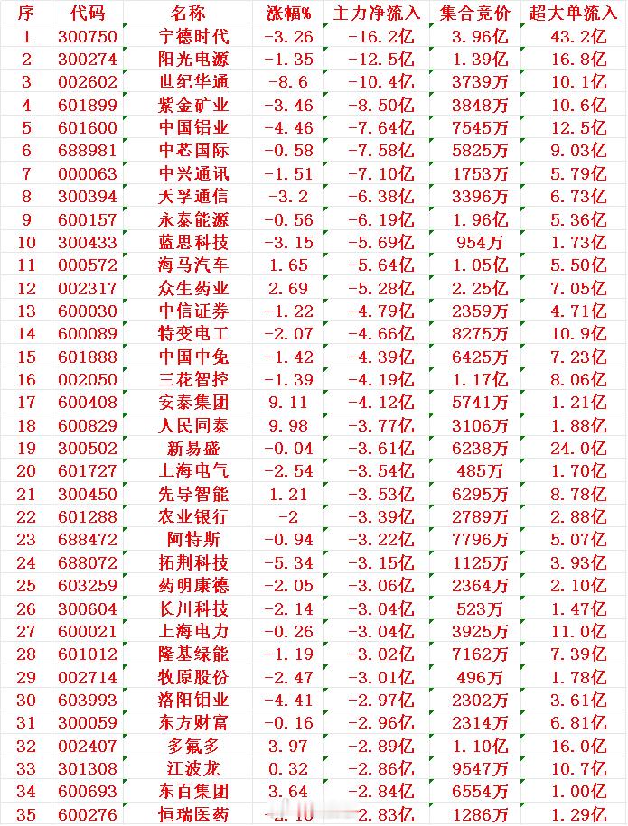 11月17日尾盘30分钟,主力资金大幅卖出的35名单!宁德时代:净流出16.2亿元,集合竞价成交额3.96亿元;阳光电源:净流出12.5亿元,集合竞价成交额1.39亿元;世纪华通:净流出10.4亿元,集合竞价成交额3739万元;紫金矿业:净流出8.50亿元,集合竞价成交额3848万元;中国铝业:净流出7.64亿元,集合竞价成交额7545万元。