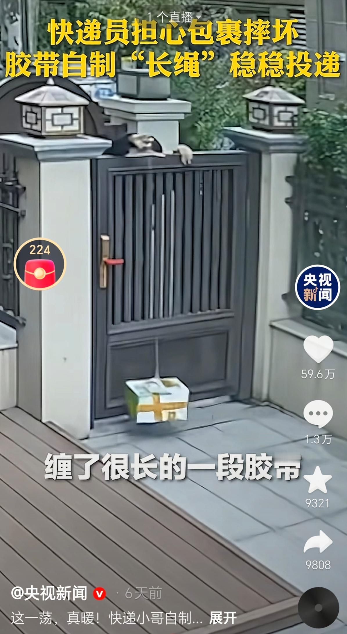 天津的这位顺丰小哥,送快递的服务,真的很暖心和到位。为此,顺丰还奖励了他6000元奖金。说起来,事情是这样的,他去送一份快递的时候。客户不在家,并且让他把快递,扔在院子里就可以了。 但,快递小哥为了不让快递损坏,特意用透明胶带绑住。然后爬上大门,把快递慢慢吊着,往下放。考虑到快递放门前,会影响开门。他还拉着透明胶带,把快递慢慢的,用力的荡到大门旁边的平台上。再轻轻的放下,这样快递就平稳的放在了平台上。 等客户回家后,看到快递放在平台上,而且还缠绕着透明胶带。于是查看了监控,才发现了,快递小哥这个暖心的举动。