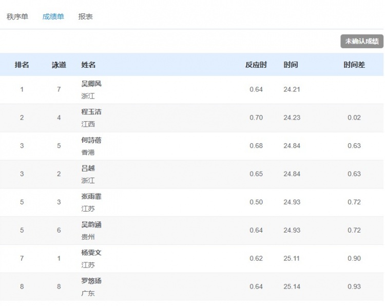 直播吧11月17日讯全运会游泳女子50米自由泳决赛,吴卿风以24秒21的成绩夺得冠军,程玉洁收获亚军,何诗蓓和吕越并列季军。