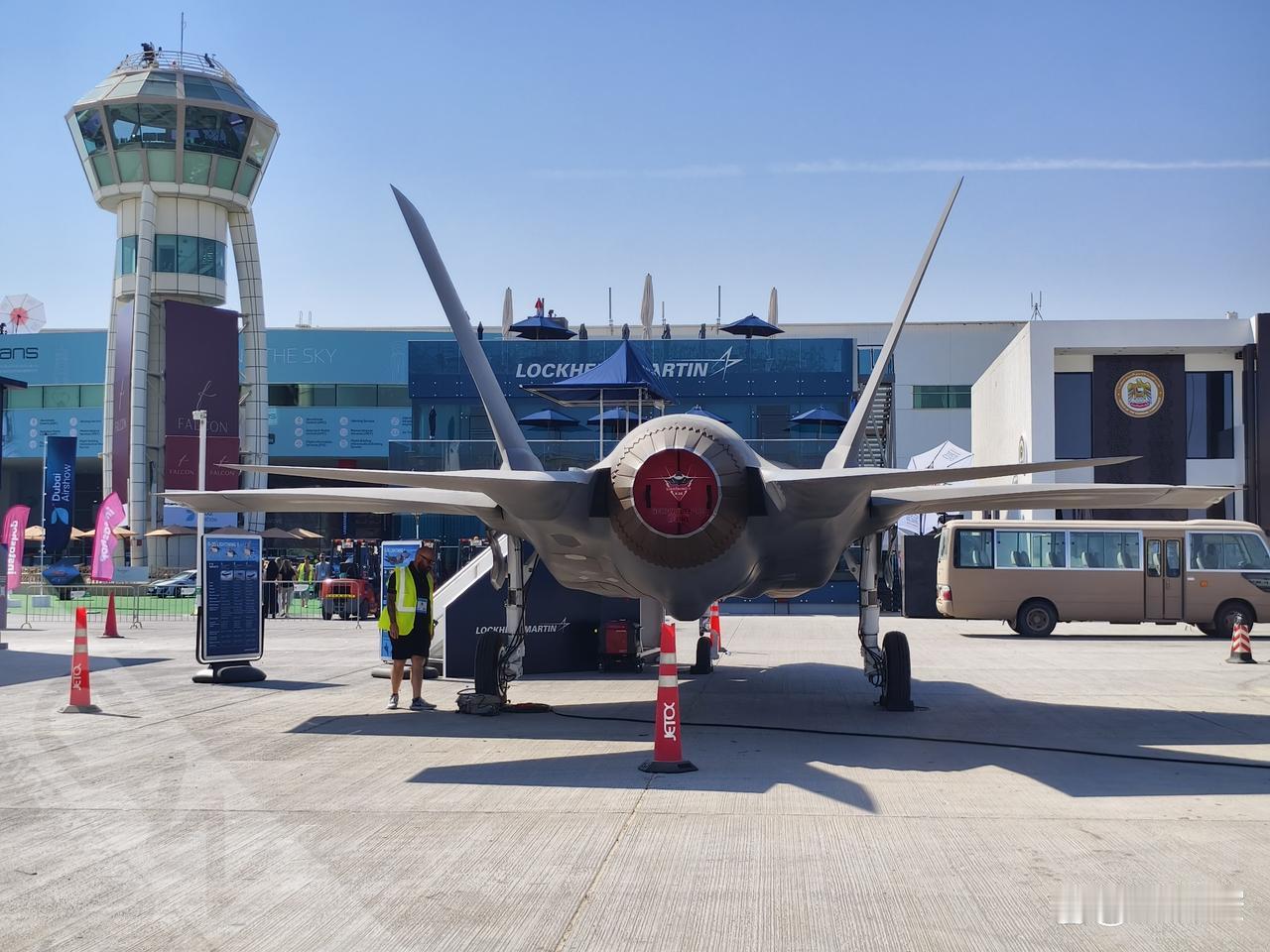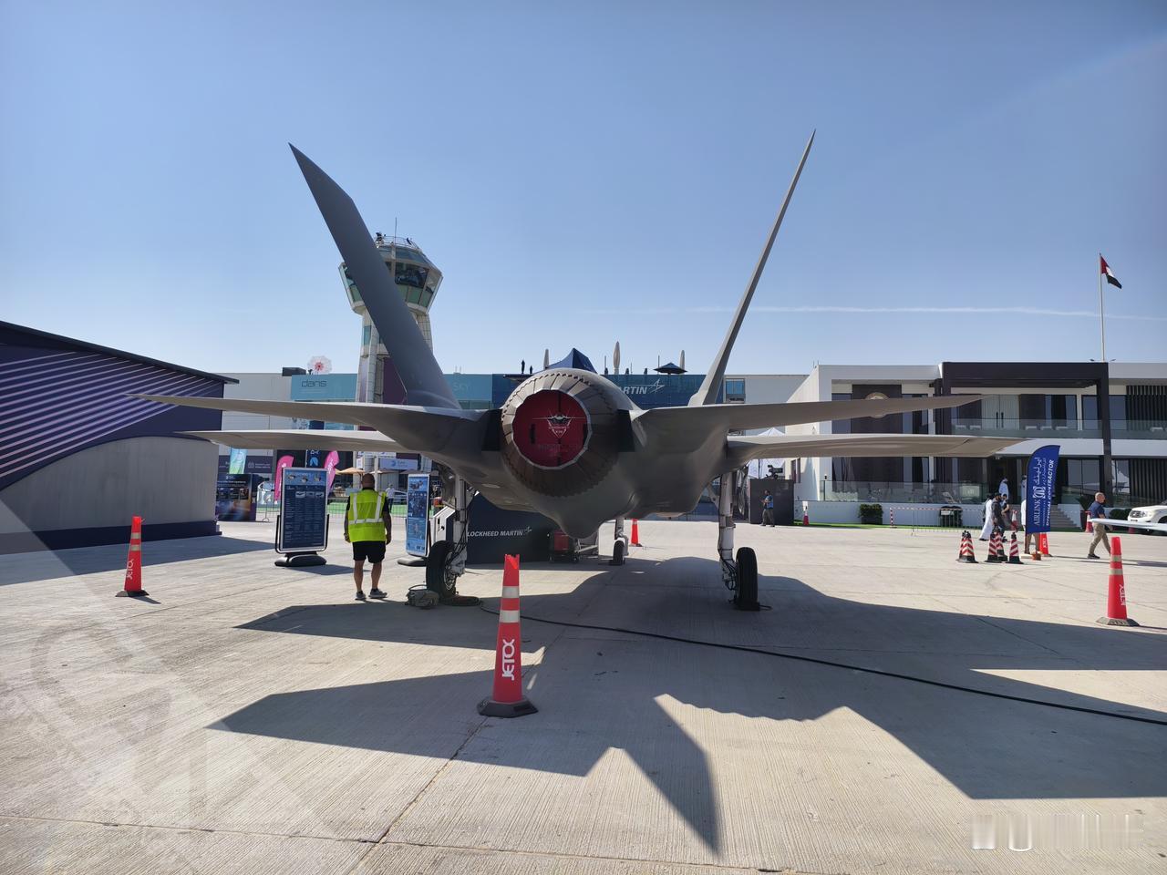 2025年迪拜航展开幕首日,一架F-35在洛马室外展区亮相。(摄影:吴紫磨)
