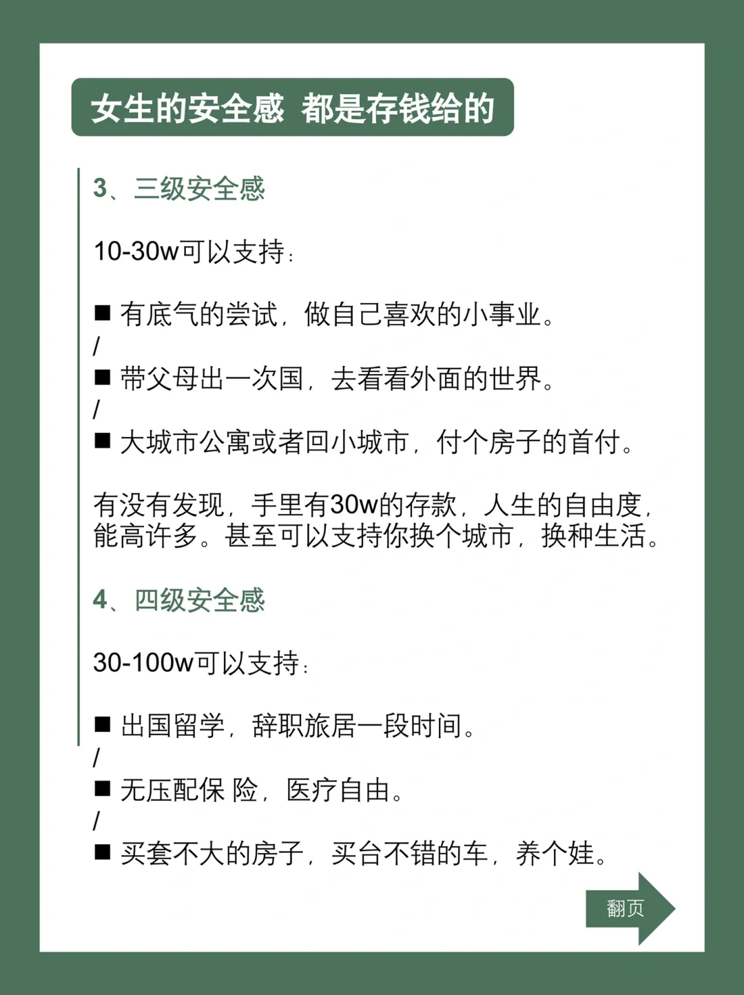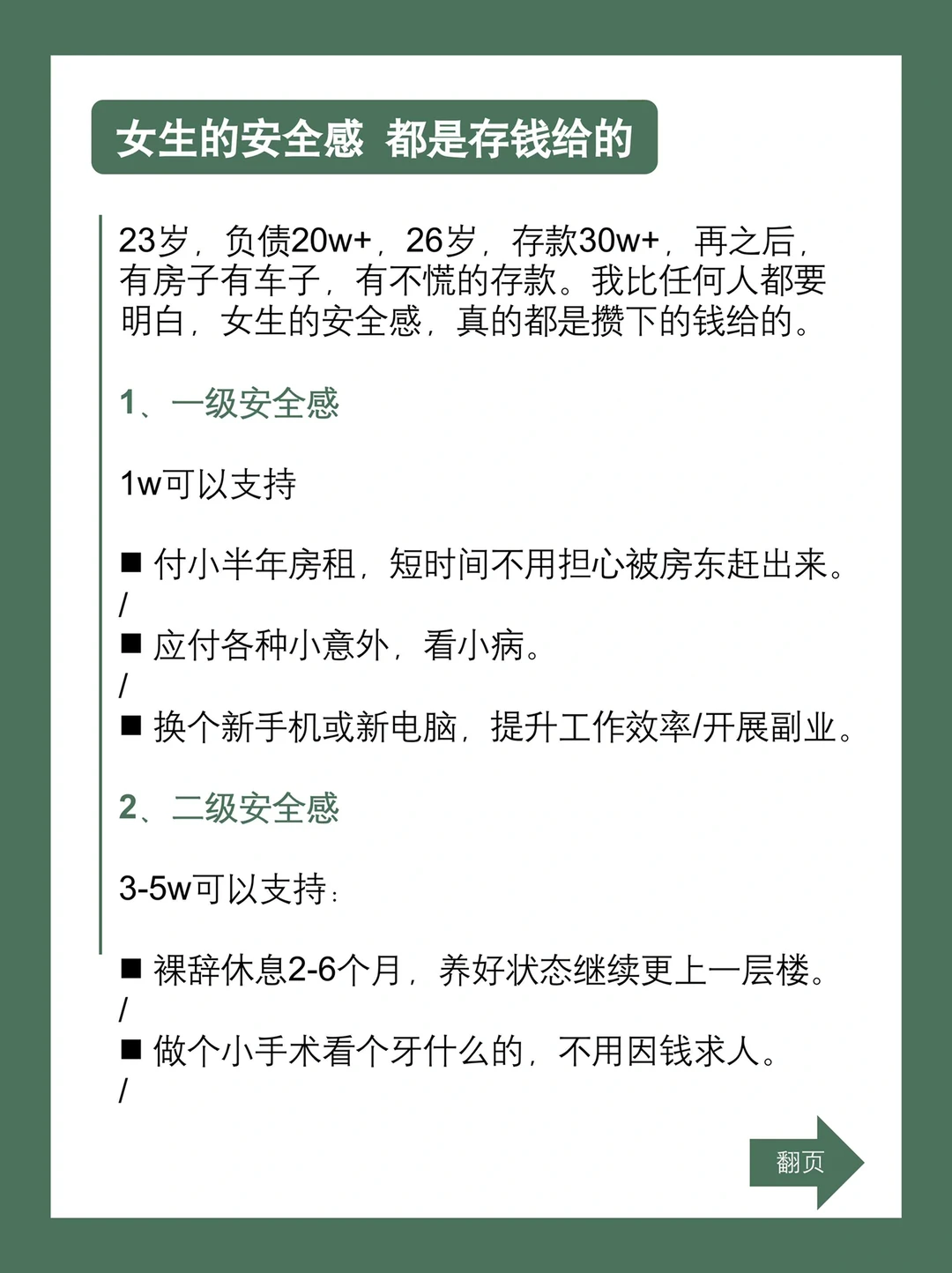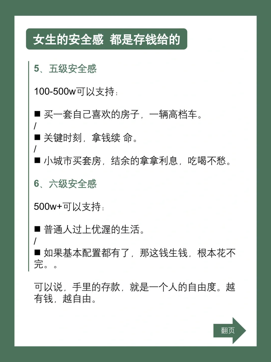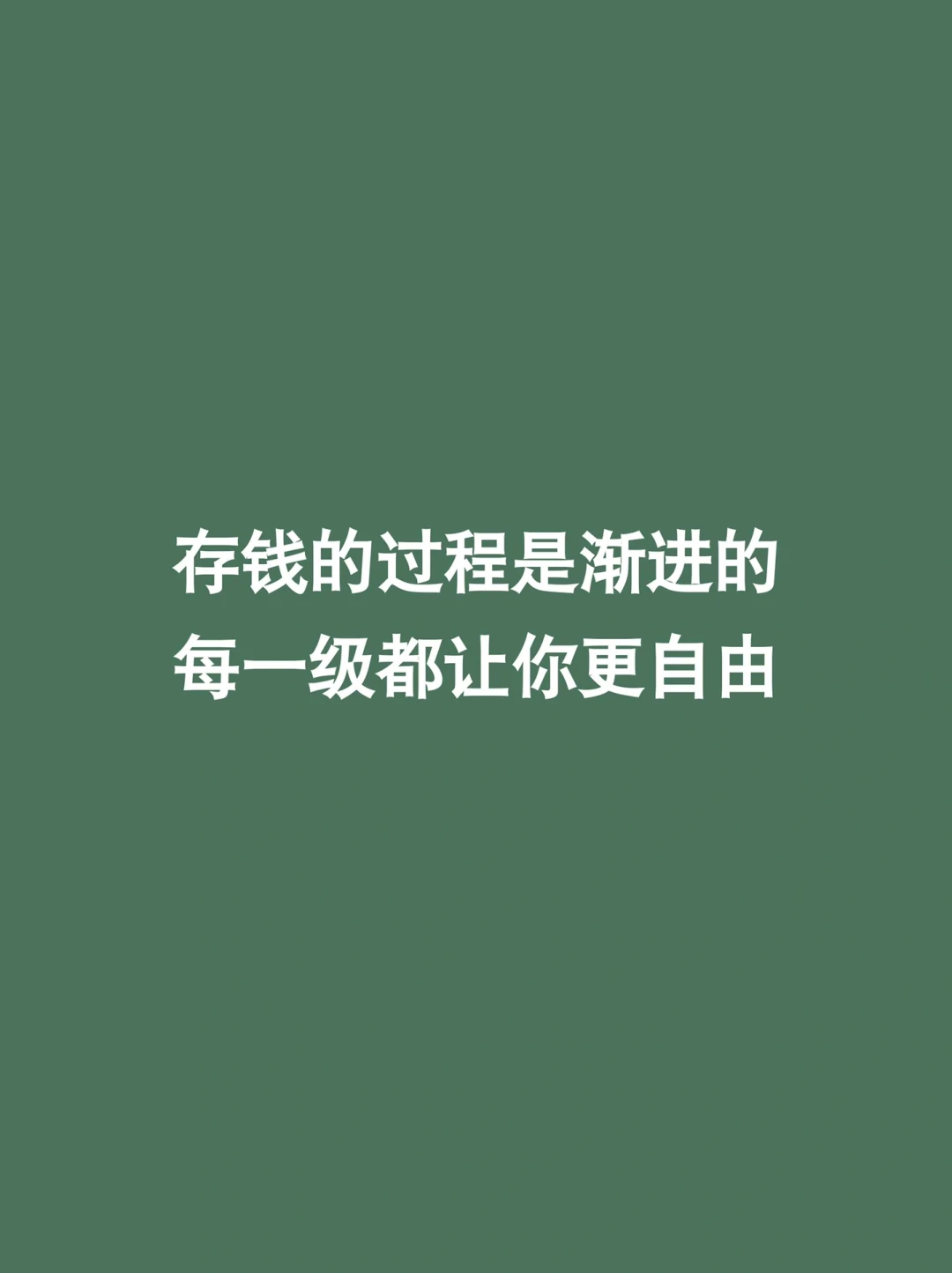 5⃣️可以说,不管在哪一个阶段,手里的存款,就是那一刻,我们生活的自由度,也是我们通往下一层级的基石和底气。存钱攒钱路上,有刻度,有目标,更容易达成。希望我们都可以朝着自己想要的安全感,一起都越来越有钱,越来越自由。