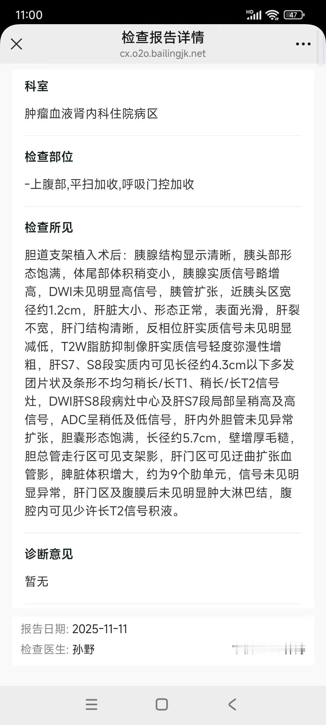 胰腺癌手术不能切除怎么办?胰头癌最常见的症状就是梗阻性黄疸,大多数患者可以经过胆道支架引流减黄来缓解黄疸症状,但是不能对肿瘤进行处理;很多患者甚至医生担心,放置了胆道支架会不会影响海扶刀治疗,其实海扶刀治疗是非常精准的消融治疗方式,超声波聚焦后焦点只有3mm大小,可以在不损失血管和胆到支架的情况下,对肿瘤进行消融。 这是我们一个月前治疗的一名晚期胰腺癌,病人放置了胆道支架,海扶刀治疗依然对整个肿瘤进行了完全消融,术后复查显示肿瘤血管,胆道支架也没有任何损伤,海扶刀治疗后三天就正常出院,一个月后患者在当地复查了磁共振,磁共振显示肿瘤已经完全吸收看不见了。陈谦医生海扶刀治疗病例集 中晚期胰腺癌能治愈吗?