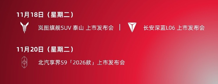 本月下旬新车发布日历🗓️11月18日岚图旗舰SUV泰山上市发布会长安深蓝L06上市发布会11月20日北汽享界S9「2026款」上市发布会