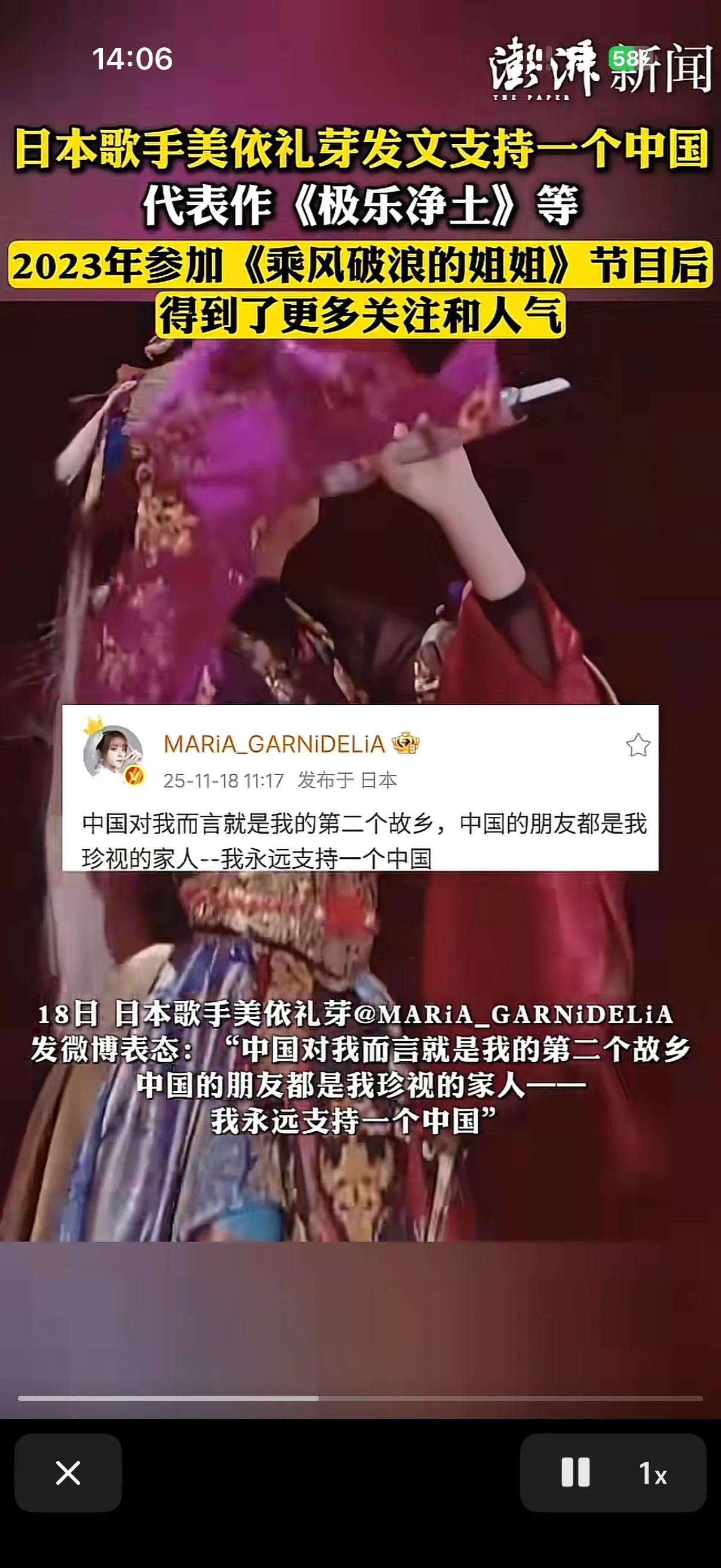 美依礼芽公开发表支持一个中国! 说实话,没想到美依礼芽能够公开发表支持一个中国的言论! 要知道美依礼芽可是日本歌手,在支持一个中国上,别说很多外籍演员对这个话题都会选择回避,就是一些在中国国内演出赚钱的歌手和明星,尤其是台湾籍的演员!一旦被粉丝正面询问是否支持一个中国的时候,都会顾左右而言他! 可以说以前大家喜欢美依礼芽都是因为她的歌曲极乐净土和当初她参加乘风破浪的姐姐时候的表演! 同时美依礼芽表示中国是她的第二个故乡! 现在大家看了美依礼芽的发文后,估计会更喜欢她了!