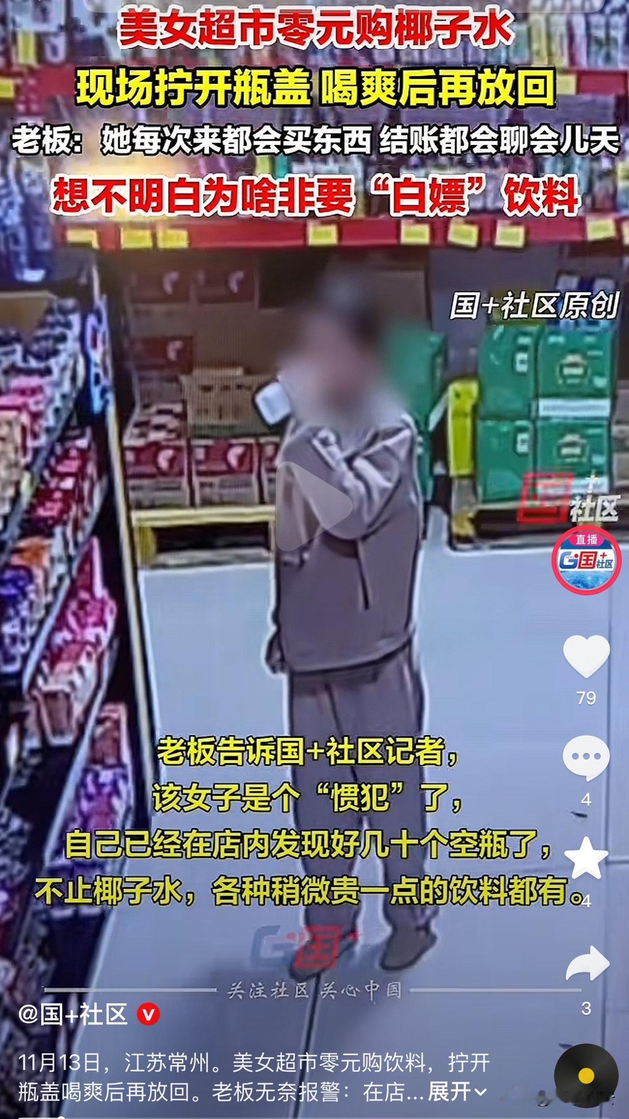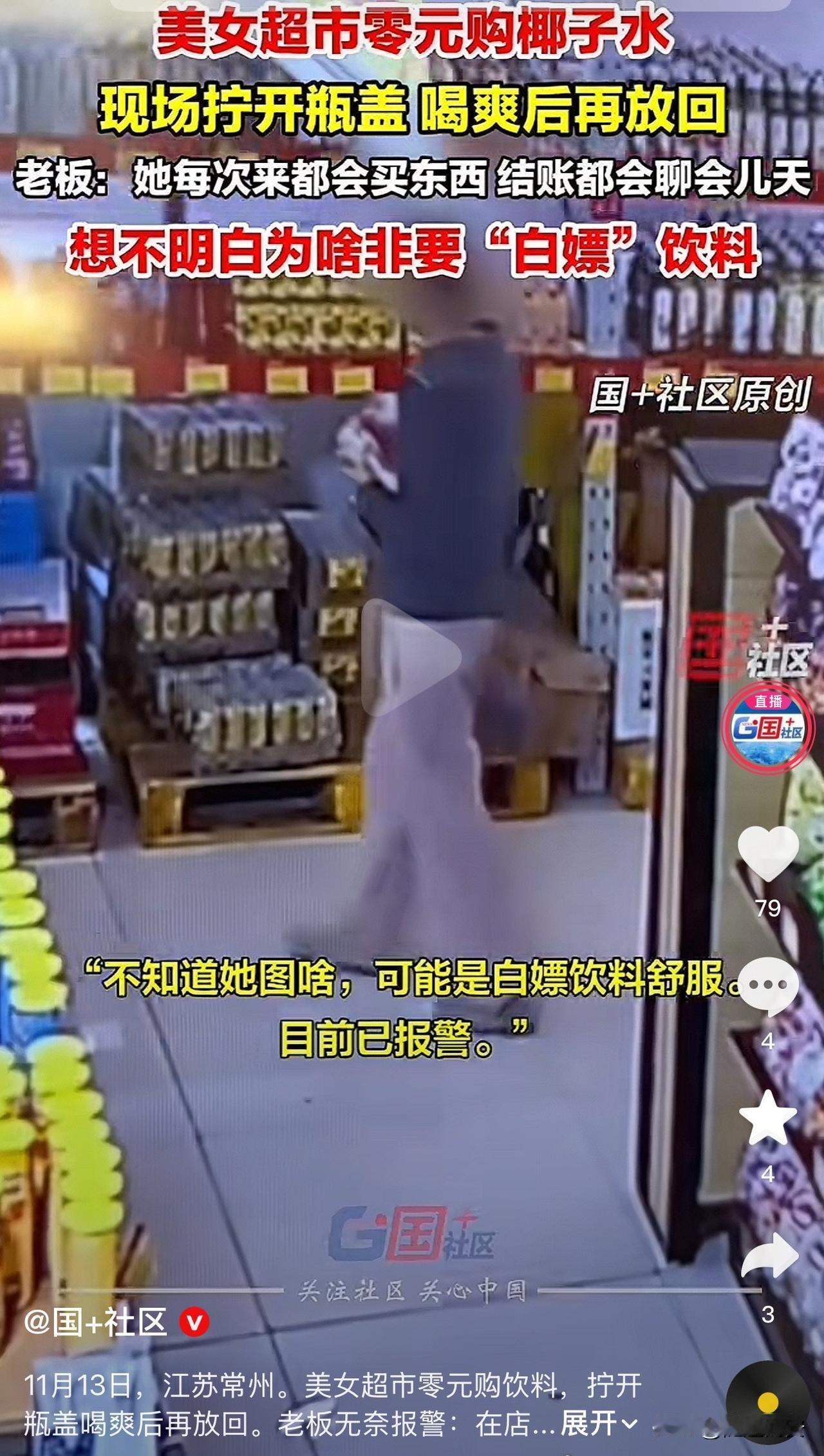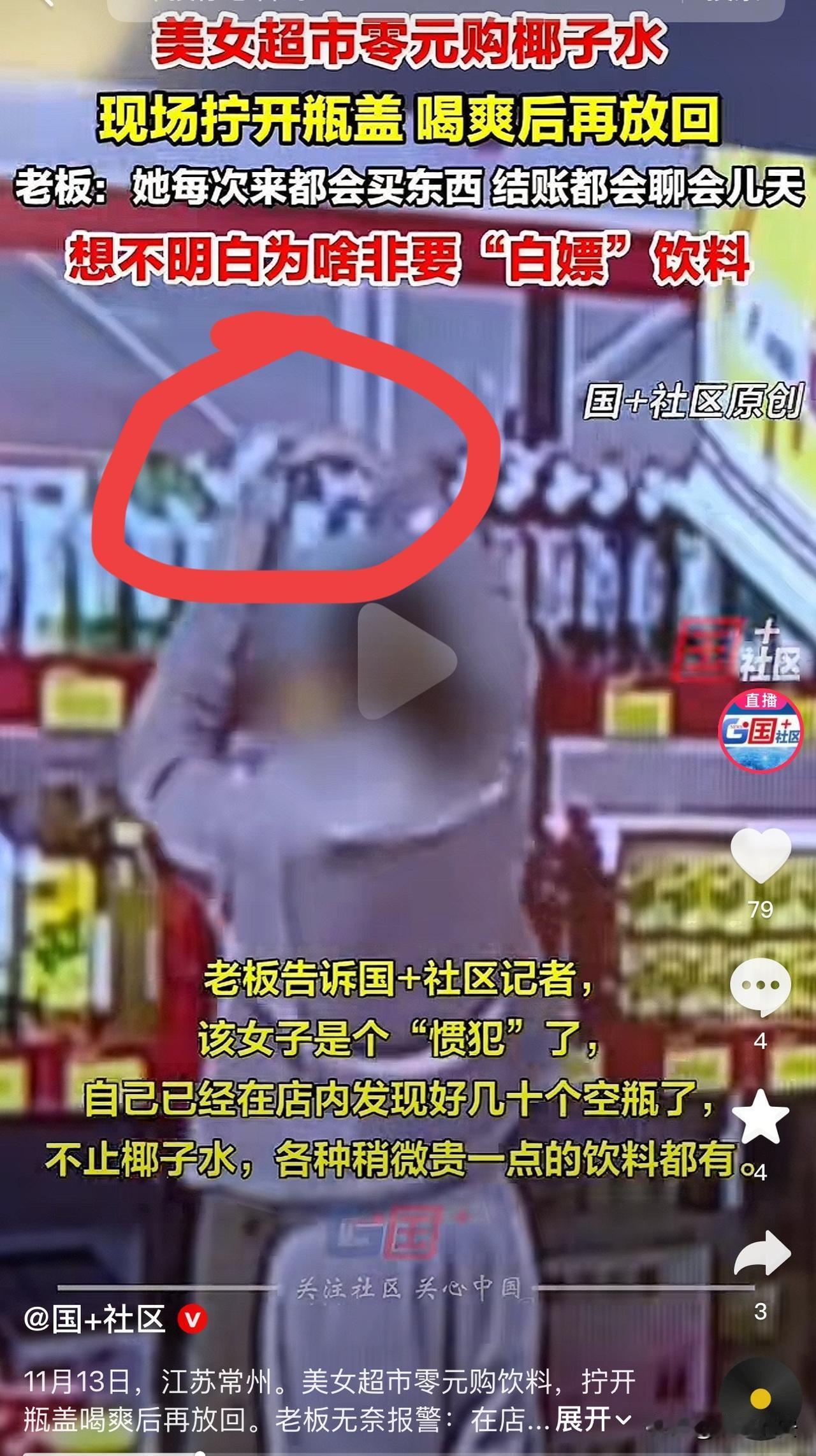 江苏常州,一女子逛超市,随手拿起饮料开盖后就喝,喝完后还不忘放回去,目前她喝了不止几十瓶饮料。让人想不明白的是她每次来都会买几十块钱的东西,可是她为啥要“白嫖”呢? 通过监控视频看出,该女子在喝完饮料后,会把空瓶子藏匿到货品的后边,以此来避免店家查出来。 可是她的这波操作早就被监控拍下来,店家称,她每次来都会买几十块钱的东西,而且在结账的时候也会跟收银员聊会天,但是她始终想不明白,这个女子到底是图啥,或许是图“零元购”喝的爽。 这名女子是个“惯犯”,从店里搜出来她喝的饮料空瓶有几十个,目前店家已报警。 人们常说“做贼心虚”,但是该女子开盖喝饮料的时候,心可一点也不虚,她做这一切的时候,竟能做到如此的淡定自如,仿佛是在自家房间喝东西。 其实我想问,她是怎么能做到如此淡定的“零元购”的呢?看她每次买东西都会付钱,也不像是缺钱且心里有问题的人啊? 估计是贪小便宜这个习惯成自然了,要不你看她这一系列行云流水的动作,和超强的心理素质,应该不是第一次干这种事了。 所以她这种胆大包天的违法行为,不仅要曝光她,更要让帽子叔叔好好批评教育一番!