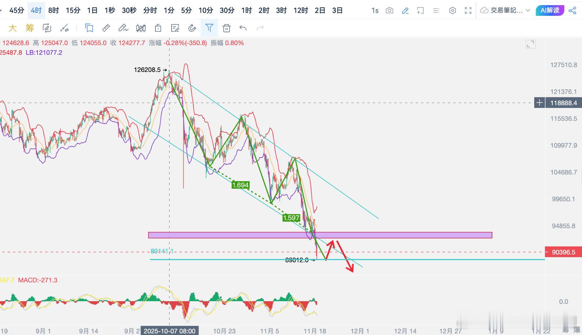 萨尔瓦多政府于2025年11月18日再度增持1090枚比特币,投资额约1亿美元,此举使其比特币总持仓增至7474.37枚,当前资产价值约6.87亿美元。自2021年9月成为全球首个将比特币作为法定货币的国家以来,萨尔瓦多持续推动比特币的采用与积累,近期还曾在“比特币日”上购入21枚,展示了其对这一数字资产的坚定信念。这一增持行动反映了萨尔瓦多在全球加密货币市场中的不断增强的影响力和对比特币的长期战略布局。那么比特币的价格是否再此次跌破9万而终止下跌呢?我认为不可能。价格在跌破9万有一定的反弹力度,都是再正常不过。可反弹不代表着行情反转。只是价格波幅正常轨迹。月线级别,价格走阴现在量能还在逐步放量。k线价格现在即将触及中轨的支撑点,那么此位置可能存在较大支撑。不破空头难以延续。那么后期需要关注86600支撑点。四小时价格还是保持在下轨下方运行,可见空头优势。直接带动指标呈现向下拐頭,并且macd继续走空头放量,综合上述空頭依旧走强,那么反弹可以继续看跌思路围绕92300-92500区域分批空,目标看向88000关口附近
