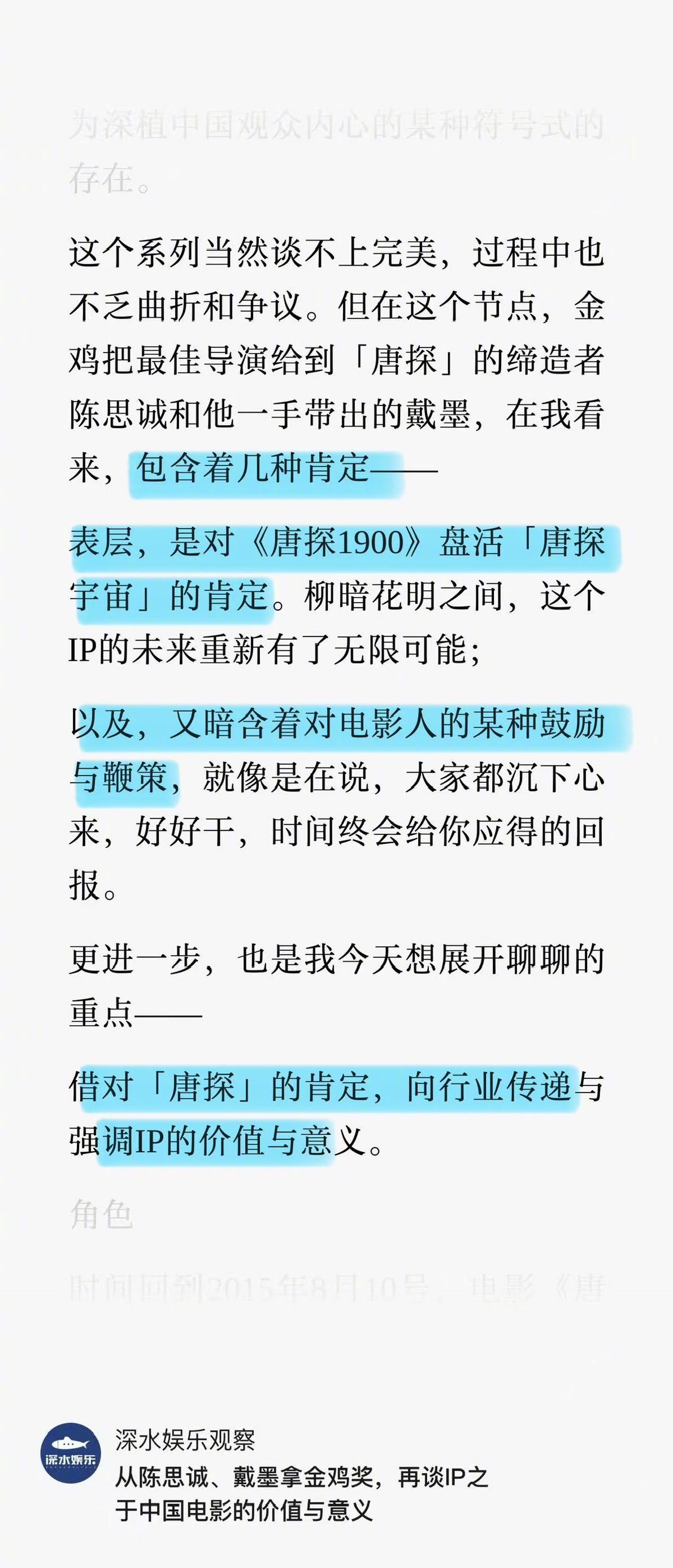 中肯的,虽然陈思诚有的时候也会让人觉得一头问号,但对于如何把一个电影进行IP化、产业化的运营方面确实是很难有第二个人做到他这样。这两年电影市场不好是全行业都看得见的事实,或许金鸡也有提振的考虑,行业需要这样一个对商业化运作的鼓励电影人们应该明白只有落在人群中,人群才能将他们捧起来的道理