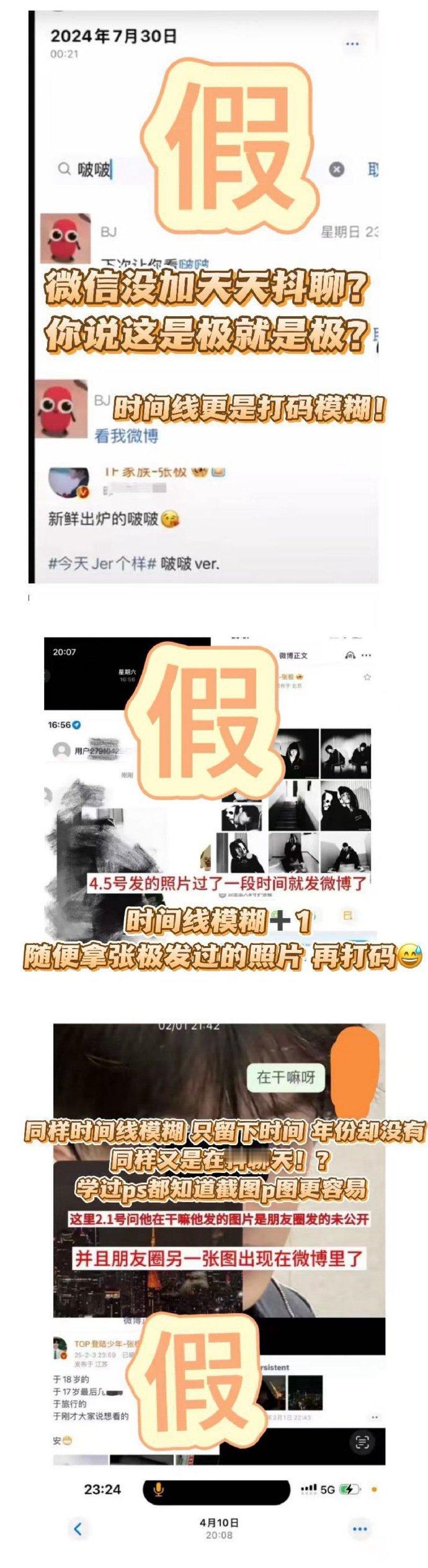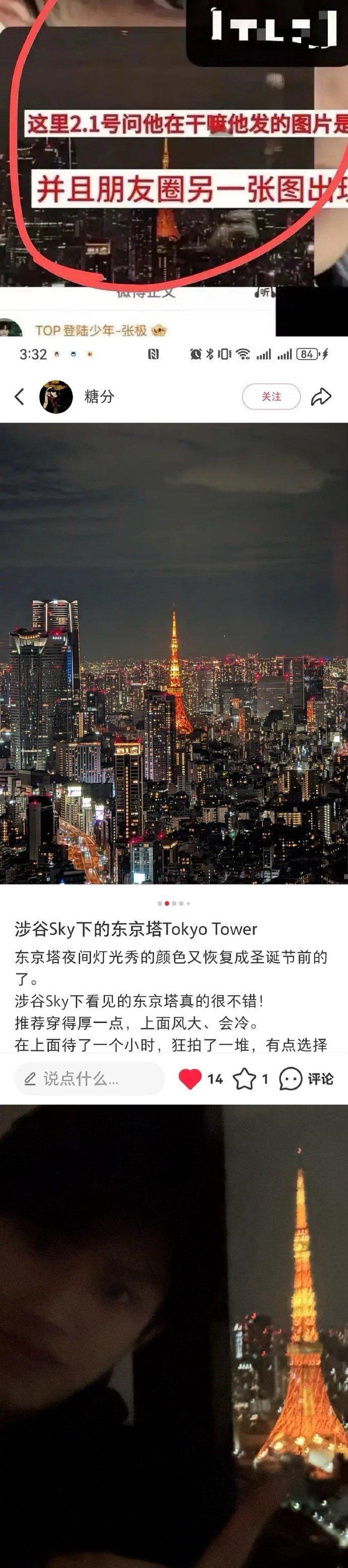 张极粉丝澄清私联瓜!1️⃣东京塔找的小红书网图,并且和张极微博发的视角不一样,完全是造谣(图1)2️⃣520当天张极微博营业穿的桔色衣服,线下穿的黑色,并非聊天记录粉色(图2)3️⃣时间线全部打码完全对不上
