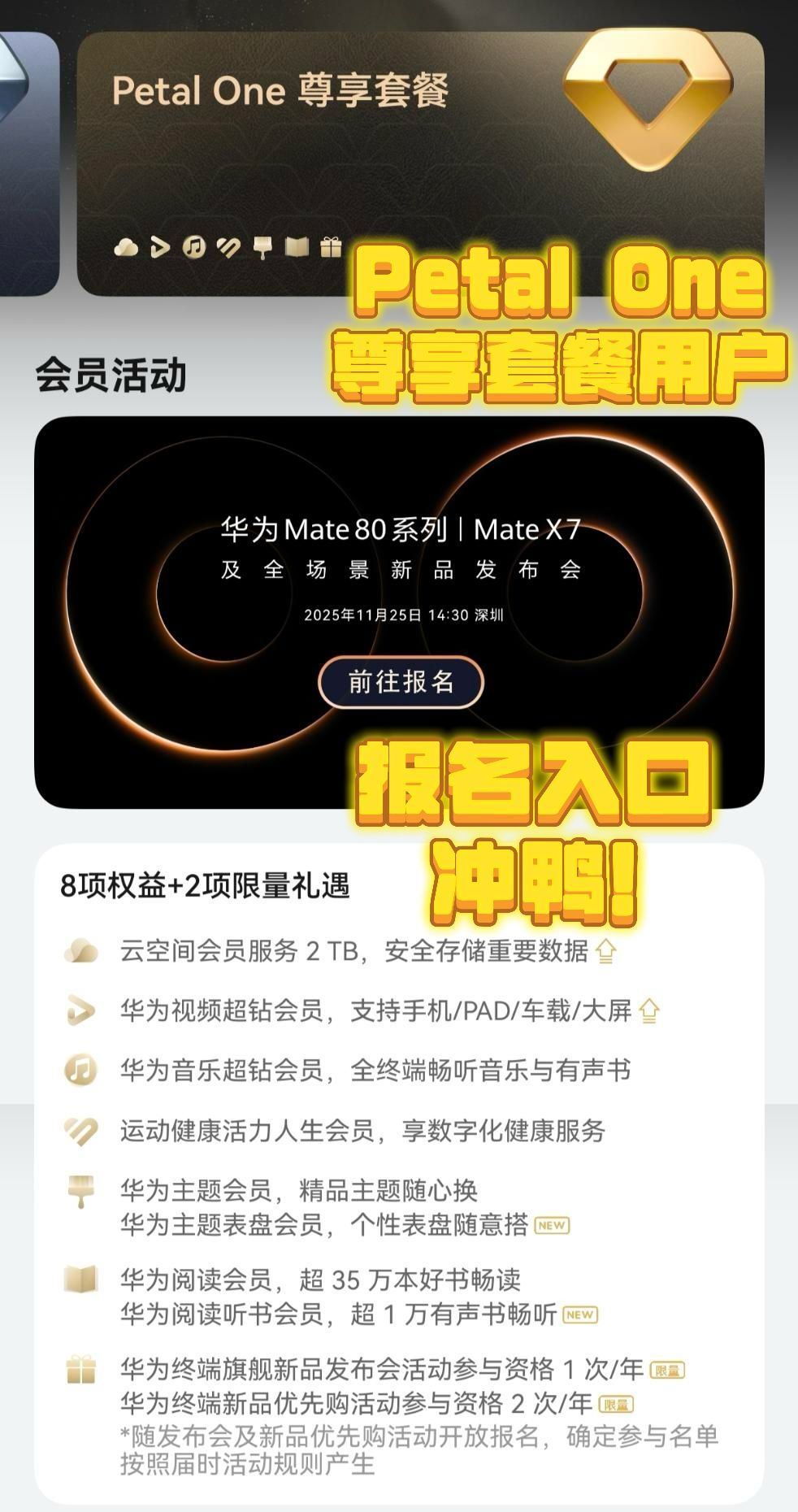 华为Mate 80系列、华为Mate X7和全场景新品发布会终于官宣啦!11月25日在深圳召开,终于可以一睹为快了订阅了华为Petal One尊享套餐的用户注意啦,套餐里每年一次的“华为终端旗舰新品发布会参与资格”报名通道已开启,报名即有机会现场直击新品发布现在去手机负一屏搜索“尊享”点击进入,切换到尊享套餐页就能看到活动入口,填写信息即可报名成功报名时间是11月17日至11月20日中午12点,官方会按报名用户的尊享套餐连续订阅的天数排序,前100名直接拿到现场名额!手速和订阅时长都很关键,想亲临现场的话建议抓紧动起来啦~升级鸿蒙5.1及以上的用户别忘了去领,每日签到有超值福利,幸运的话抽中Petal One悦享套餐就可以免费体验啦~