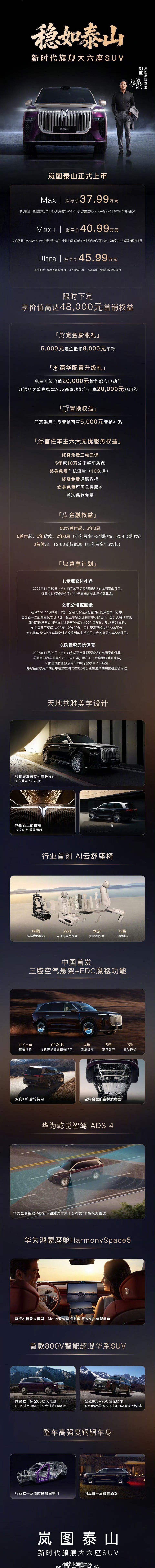 岚图泰山正式上市,,售价37.99-45.99万元,也是一辆全尺寸SUV,21分钟大定10000台。上周的智己LS9等等,都是9系Suv的逆袭代表,国人对中大型SUV的热情度确实越来越高了啊!
