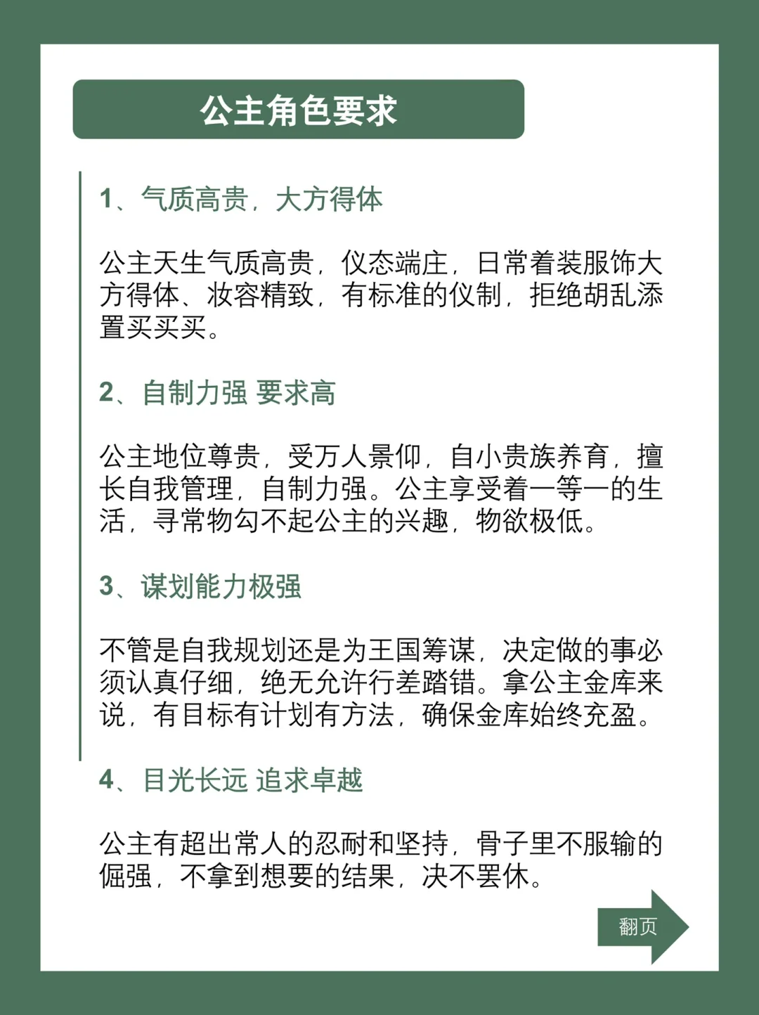公主出生尊贵的同时,也肩负重任。自小就懂得筹谋,做事带有强烈的目标导向,总是有计划有方法的去达成自己的目的,拿到结果。