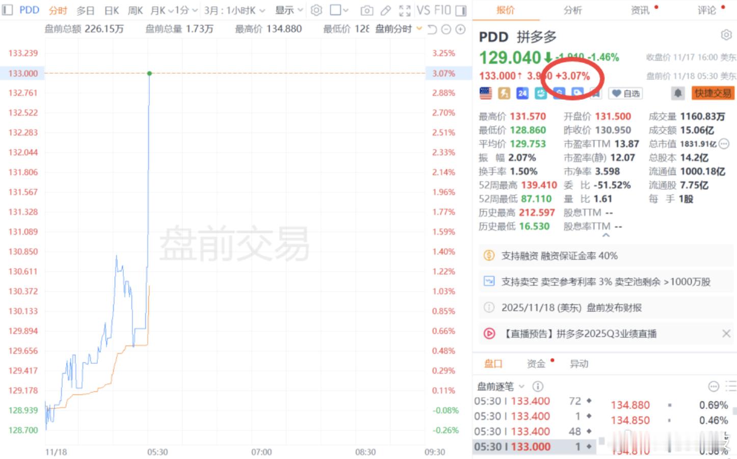 【】11月18日,拼多多美股盘前涨逾3%。公司第三季度营收1,082.8亿元,预估1,075.9亿元;三季度调整后每ADS收益21.08元,预估16.86元。各位网友,您怎么看?(财联社)