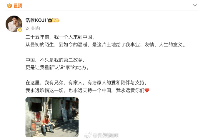 今天,日本艺人美依礼芽 、矢野浩二 相继发微博表示:“永远支持一个中国。”美依礼芽说:“中国对我而言就是我的第二个故乡,中国的朋友都是我珍视的家人。”矢野浩二表示:“中国,不只是我的第二故乡,更是让我重新认识‘家’的地方。”(央视新闻)
