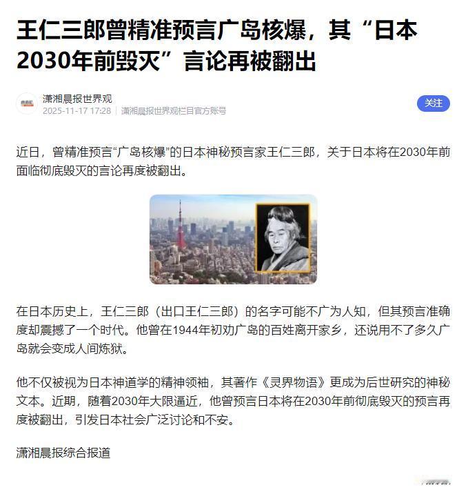 日本有一个非常著名的预言家——王仁三郎、他曾经预言2030年前后日本将会灭亡、这个预言最近又在日本国内引发讨论了、主要原因是王仁三郎这个人、他曾经预测过日本会遭受原子弹的打击、结果应验了、所以现在很多日本人都认为他关于2030年日本灭亡的预言跟现在高市早苗的错误言论是有直接关系的! 在日本民间的预言圈里,王仁三郎绝对是能排进“顶流”的人物,不是因为他预言多花哨,而是因为一句话砸实了自己的“金字招牌”——早年间他就撂下过“日本会被天上掉下来的大炸弹炸得稀烂”的话,那时候没人当回事,毕竟谁能想到有原子弹这种“末日武器”。 结果1945年广岛长崎的蘑菇云一升起来,全日本都炸了锅,再回头翻王仁三郎的旧预言,越看越觉得“神准”。 也正因为这档子事,他另一句更狠的预言最近又被翻了出来,就是“2030年前后日本要走向灭亡”,原本只是尘封的老话题,偏偏撞上了高市早苗这波操作,直接让日本民众的焦虑值拉满,不少人拍着大腿说:“这不就是预言要应验的信号吗?高市首相这是在给灭亡加速度啊!” 最让日本民众坐不住的,就是她在台湾问题上的迷之发言,在国会里公然宣称“台湾有事就是日本的存亡危机”,暗示要动武介入,这话一出口,别说中国这边反应强烈,日本自己人先慌了。 前首相野田佳彦直接骂她“言辞越界,把中日关系拖进死胡同,相当轻率”,立宪民主党的小泽一郎更直接,算出了实打实的损失——这种攻击性言论一旦激怒中国,日本的进出口贸易就得先掉一层皮,普通民众的钱包肯定要受影响。 果不其然,没过多久中国就发布了赴日旅游提示和留学预警,这对日本来说可不是小事,要知道2024年中国游客在日消费是各国之首,日本观光厅的统计数据摆着呢,中国游客的钱包直接撑起了日本旅游业的半壁江山,现在这部分客流一收缩,不少冲绳的民宿、大阪的药妆店已经开始贴出“促销清库存”的海报,老板们愁得头发都白了。 更要命的是,中国不只是日本的“旅游金主”,还是最大的贸易伙伴,2024年中日贸易总额达到3083亿美元,中国既是日本最大的进口来源国,也是第二大出口对象国,简单说就是日本的超市货架、工厂生产线都离不开中国的商品和原材料。 高市早苗的言论一出来,日本商界直接炸了锅,丰田、本田这些靠着中国市场吃饭的车企股价接连下跌,不少贸易公司已经开始囤货,就怕哪天贸易渠道被卡。 有日本经济评论家算过一笔账,如果中日贸易额因为她的言论下降10%,日本全年GDP就得少增长0.3个百分点,这可不是小数目,相当于蒸发了几百亿人民币的产值,而这些损失最终都得摊到普通民众头上,要么是物价上涨,要么是工资缩水,老百姓能不把账算在高市早苗身上吗? 更让日本人联想到“灭亡预言”的,是高市早苗的错误言论,正好撞上了日本本身就难顶的“内忧外患”,2030这个年份可不是随便说的,恰好是日本社会矛盾集中爆发的节点。 服务业缺400万,医疗福利行业缺187万,现在不少便利店已经开始24小时改16小时营业,养老院更是直白地拒绝接收没担保人的单身老人,这种“用工荒”已经不是靠机器人或者AI能解决的。 本来日本还指望靠吸引外国劳动力填坑,可高市早苗这通操作,先把最大的贸易伙伴得罪了,中国的留学预警一发布,原本计划去日本打工的中国人都开始打退堂鼓,劳动力缺口只会越来越大,到2030年可能真的会出现“养老院没人护工,超市没人收银”的窘境,这不就应了“灭亡”的另一种解读——社会运转失灵吗? 最有意思的是,日本民众把这两件事绑在一起,还真不是单纯的联想,而是有实打实的“连锁反应”逻辑。 王仁三郎的预言之所以吓人,是因为他抓住了“外部危机引发内部崩塌”的规律,当年原子弹是外部打击,直接打垮了日本的战争意志;现在高市早苗的言论,就是在主动制造外部危机,把中日关系这块最重要的“压舱石”给晃松了。 2024年的数据显示,日本从中国进口的电子元件占比超过40%,这些元件小到手机芯片的封装材料,大到汽车的传感器,没了这些东西,日本的工厂只能停工,失业率就得往上涨,本来就少子化的日本,再加上失业潮,社会稳定都成问题,这不就是“灭亡”的前兆吗? 现在日本街头的抗议活动越来越多,几百人堵在首相官邸前举着“高市辞职”的牌子,喊着“别把我们拖进战争”,连台湾地区的马英九都忍不住说,高市的做法让人想起日本军国主义复辟,洪秀柱更直接,质问“台海的事关你日本人什么事”。 日本民众现在的焦虑,本质上不是信预言,而是信“不作死就不会死”的道理,高市早苗每多说一句挑衅的话,就等于给王仁三郎的预言多添一分“可信度”,等到2030年还有几年时间,要是她继续这么“添火”,别说预言会不会应验,日本先被自己搞乱套都有可能,毕竟民心散了,社会离出问题也就不远了。