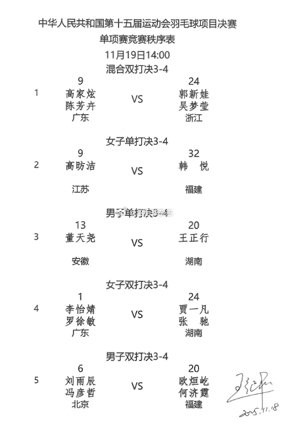 十五运会羽毛球赛11月20日单项决赛终极对决下午2点挥拍