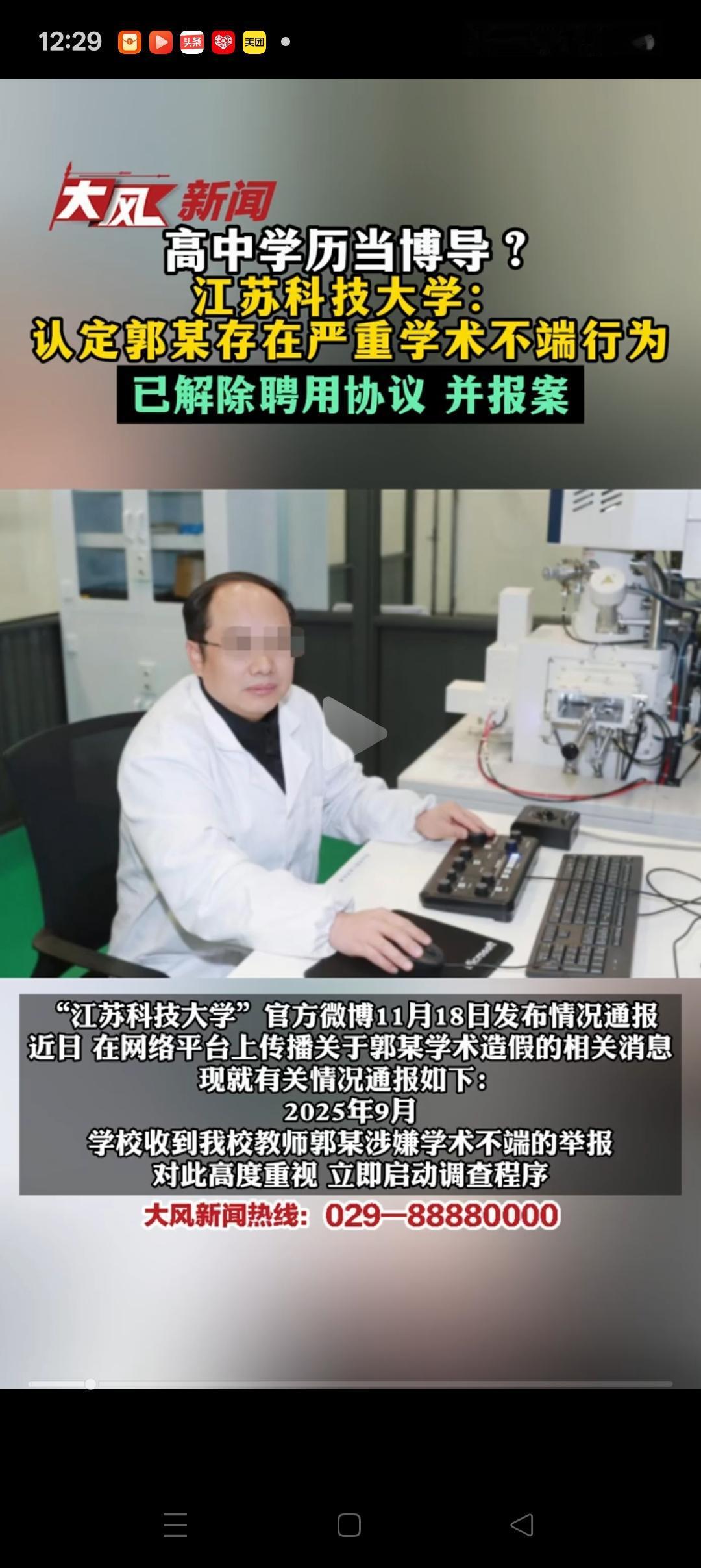 江苏科大只有高中学历的博导郭某,可能不得不面临3个窘境: 1、再也不能在大学任职了:虽然不清楚他是否有真材实料,但是学历是假的已经被证实。相信其它的大学也不会用他 2、面临学校的起诉:发给他的工资,奖金,还有一些福利都会被追回来。可能还要面临其他的赔偿,对他来说应该很难承担 3、可能还要进去一段时间:毕竟那么多学生都在他的指导下学习,耽误了他们。如果他们也一起起诉,郭某很可能要进去一段时间。 大家觉得呢?
