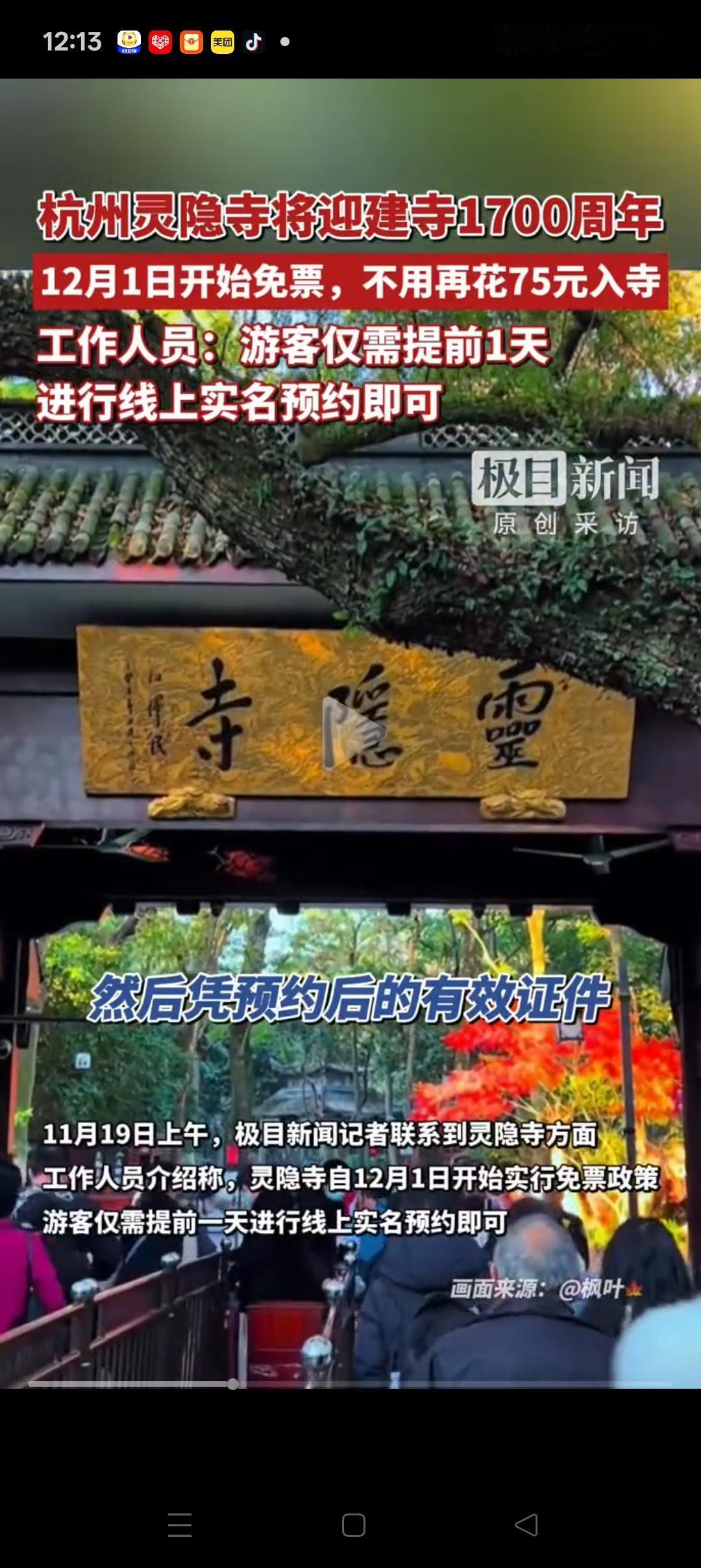 一觉醒来,杭州放大招了! 万万没想到,12月1号起,灵隐寺,飞来峰景区实行免费,只需要提前一天预约即可。 以前进入灵隐寺,需要先买飞来峰的门票,一起要花75块钱,确实不划算。 灵隐寺作为杭州最受欢迎的景区,每年来旅游的人络绎不绝,营收也不低。 这一次宣布免费,也是需要很大勇气的。 虽然没有了收入,但是对周边的饭店,酒店,杭州所有的大小商家都是个好消息! 不得不说,杭州的格局太大了,值得大家去旅游! 预计接下来去杭州的游客会迎来小高峰期吧[赞][赞]