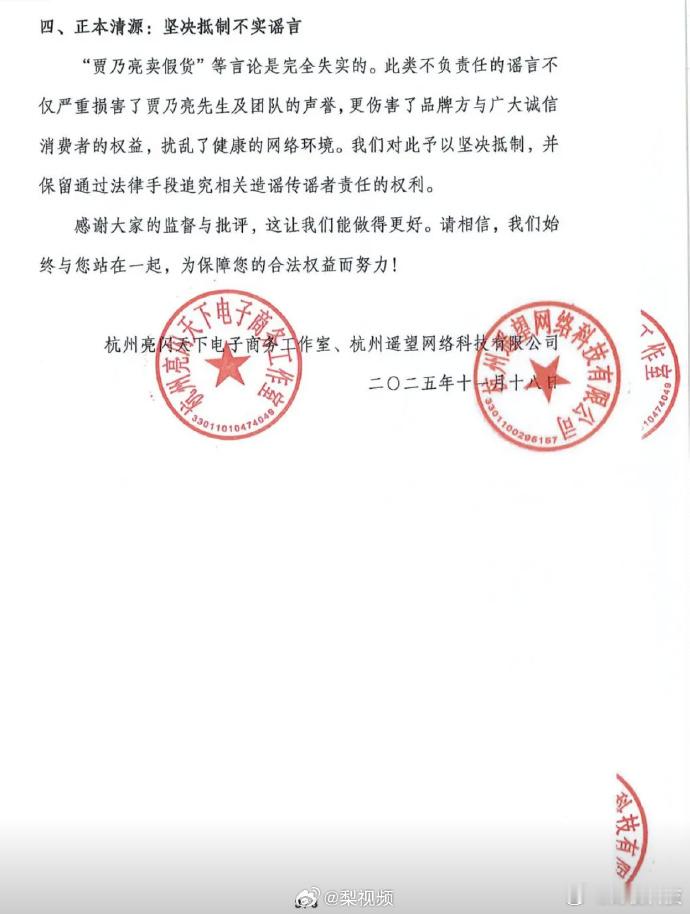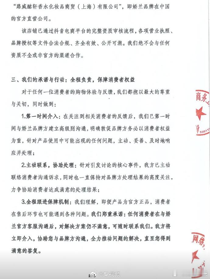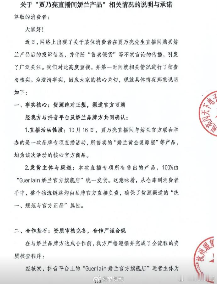 【】近日,有消费者称在贾乃亮抖音直播间购买的娇兰化妆品疑似假货,引发关注。11月18日,贾乃亮签约MCN遥望科技回应:“直播间所售娇兰产品均由Guerlain娇兰官方旗舰店统一发货,运营主体为路威酩轩香水化妆品商贸 (上海) 有限公司,是娇兰品牌在中国的官方直营公司。”随后,贾乃亮工作室与遥望科技联合发布声明回应,关于消费者此次质疑Guerlain娇兰官方旗舰店售出假货的问题,承诺将全程跟进处理,全力保障消费者合法权益。(大河财立方)